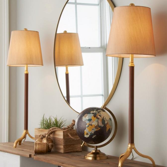 Taking inspiration from antique candle sticks, this pair of buffet lamps feature tripod gold leaf metal bases and hand wrapped brown leather accents. Beige metallic polyester/cotton fabric shades are used to complement the brown leather. The leather features a top stitched contrast trim to complete the look. Metal ball finials included.