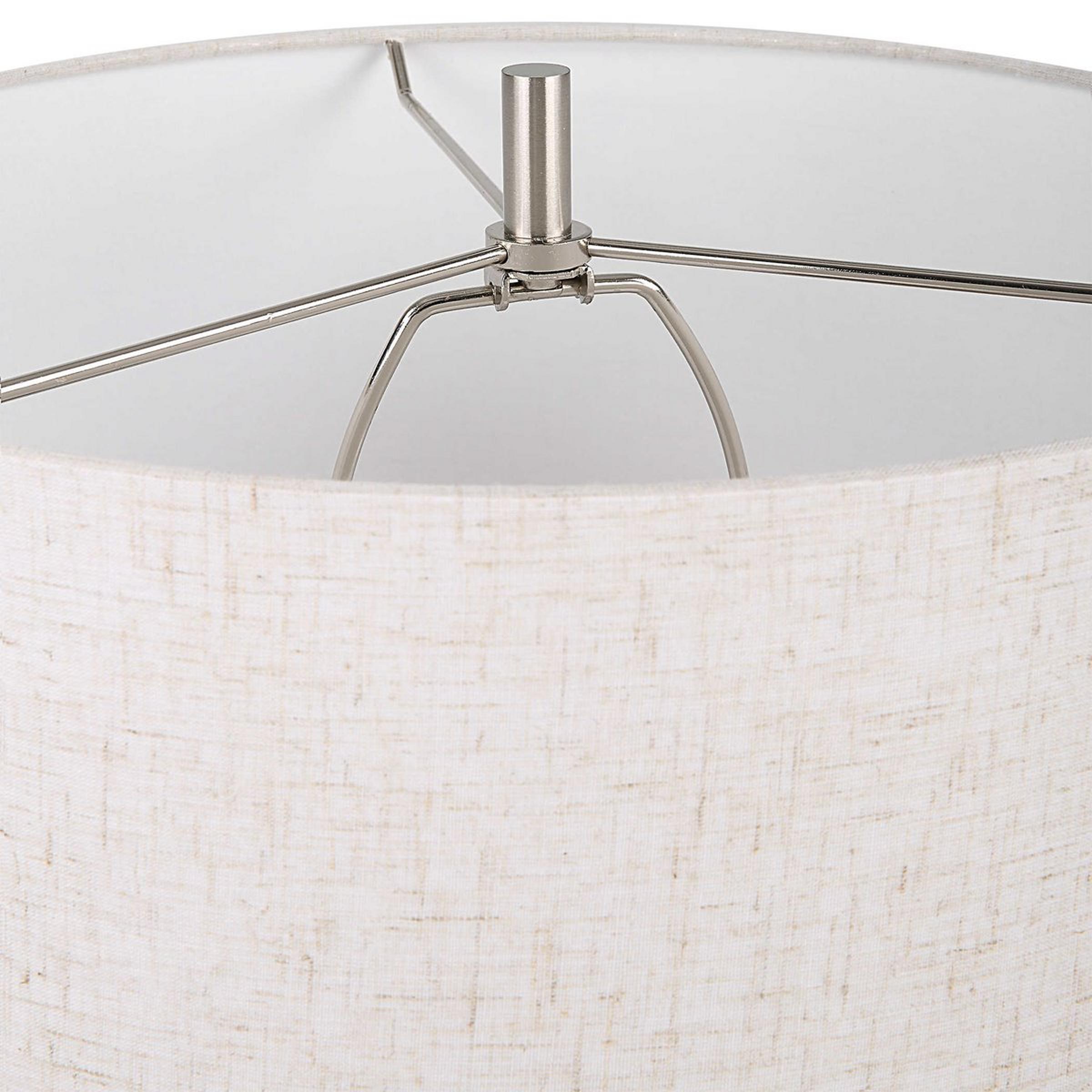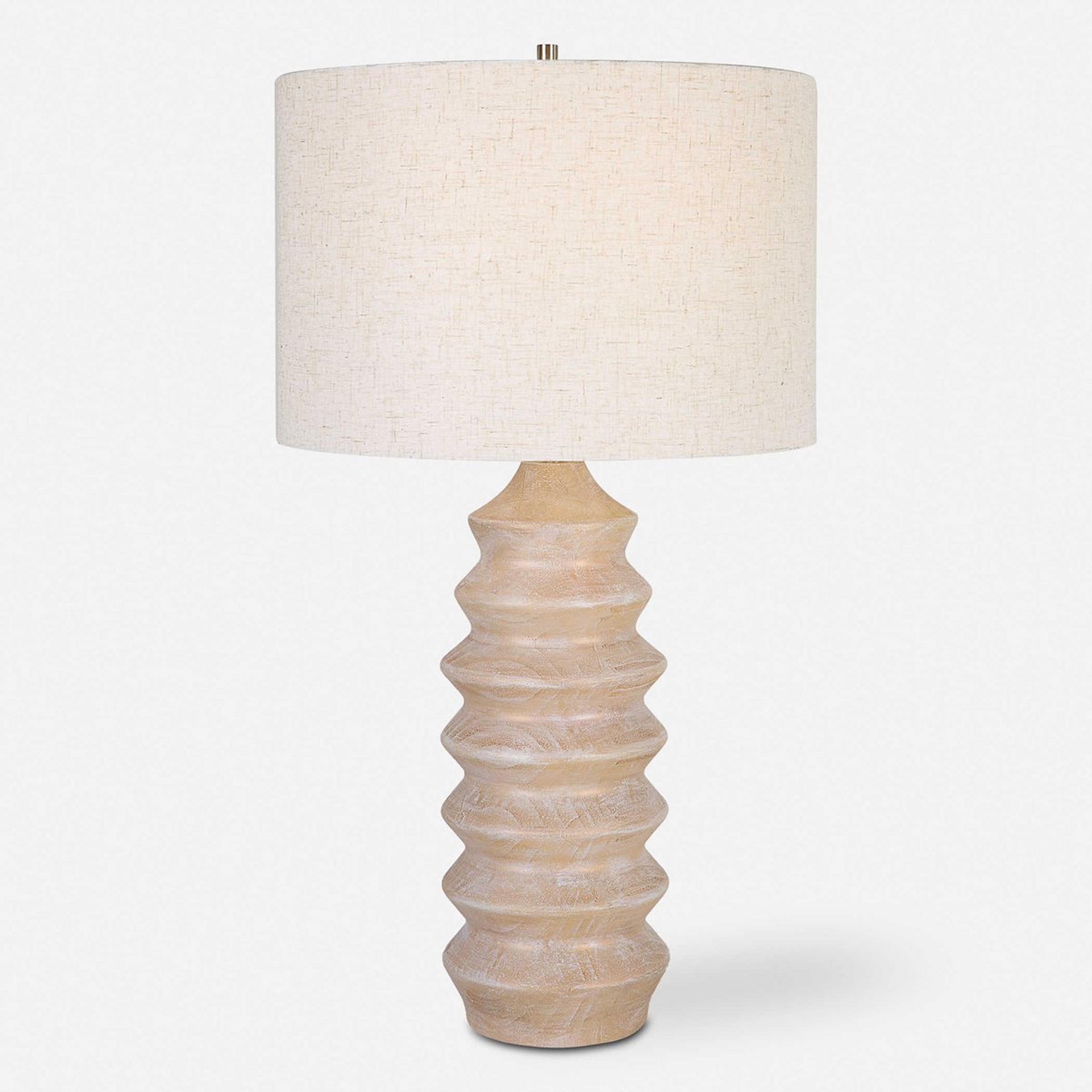 With its long geometric shape, this table lamp is fun and inviting. The faux-bleached wood tone creates a warm, almost monochrome look paired with its oatmeal shade. This stylish design creates a causal and whimsical atmosphere in any space!