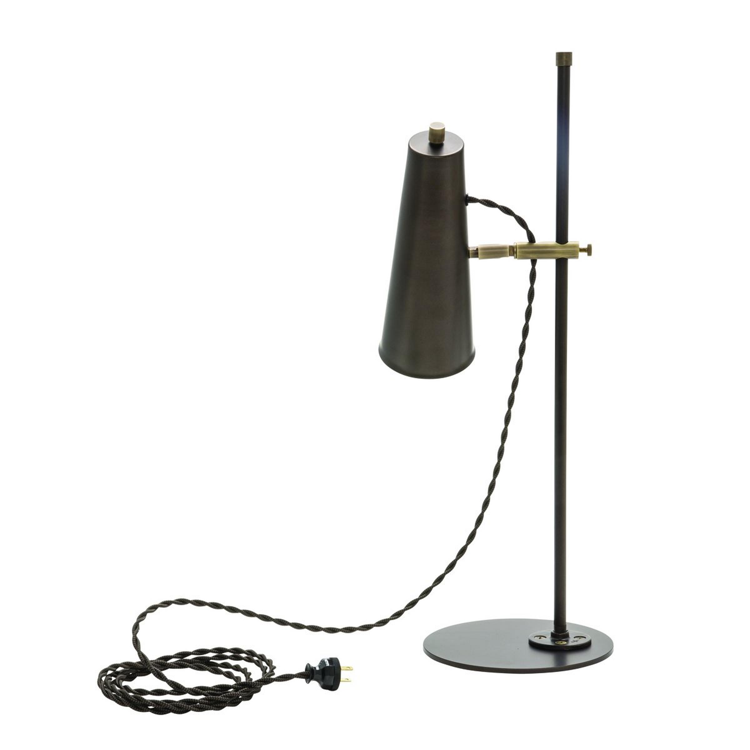 The cone shade & slender pole of our Limelight Desk Lamp offer edgy industrial intrigue whether in a living room, office space or even a classroom! The shade can be adjusted up or down and pivot left to right so that the integrated LED can shine precise lighting on the task at hand. Available in Bronze with Antique Brass or Graphite with Satin Nickel and a coordinating twisted cloth cord, this simplistic model desk lamp will make a fantastic modern addition to your space. Proudly made in the USA.
