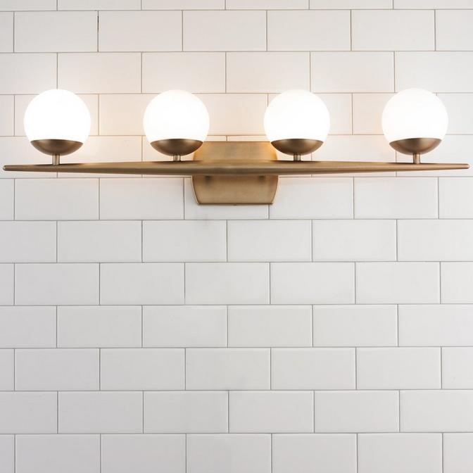 Simple modernity defines this bath light, which features four globe lights mounted on a tapered bar.