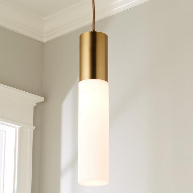 Minimalist contemporary style abounds with the soft white linear acrylic tube and thick metal band on this pendant. An elegant choice for a modern home.