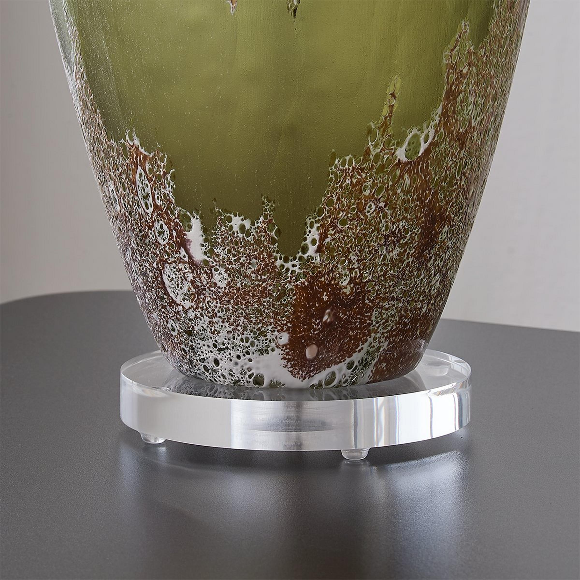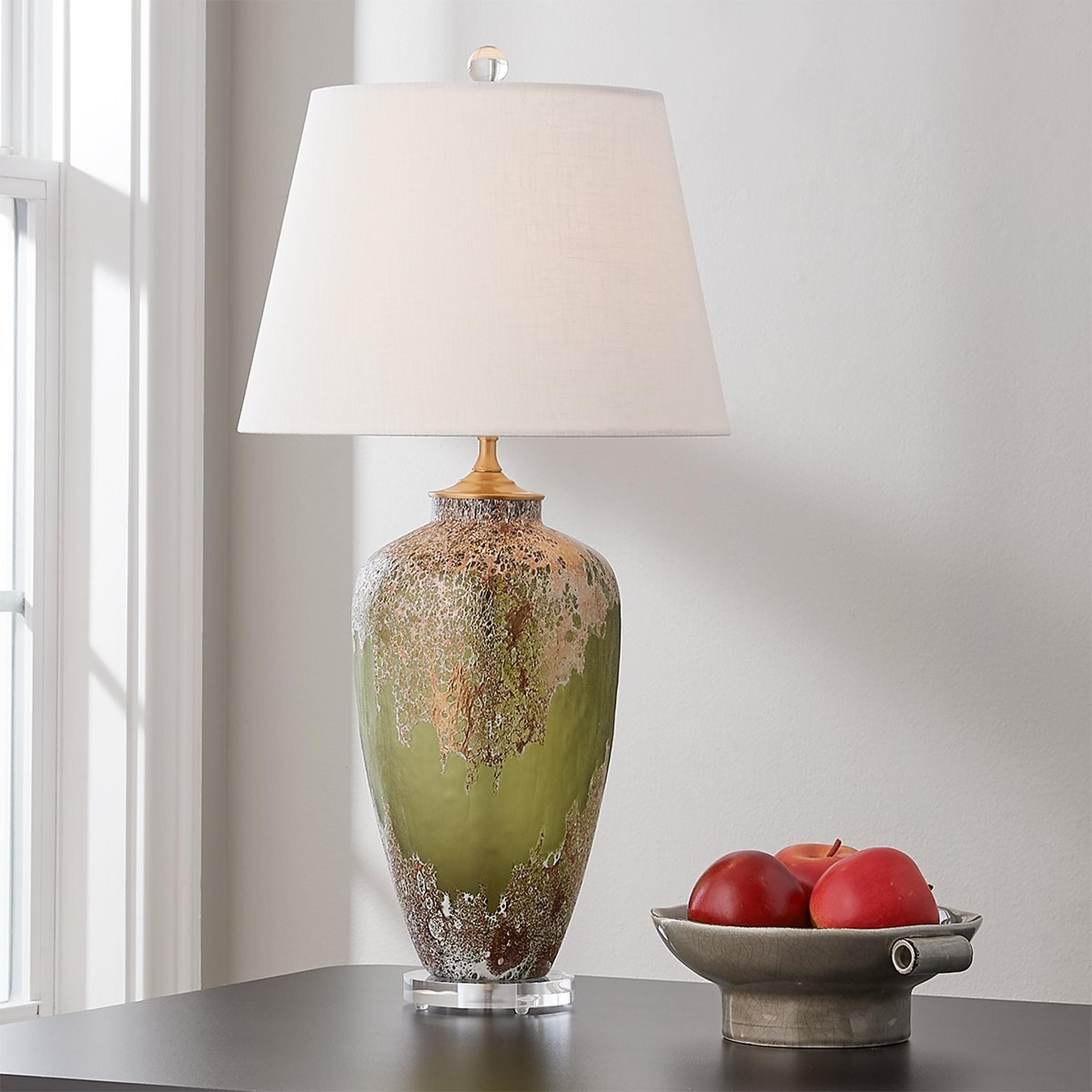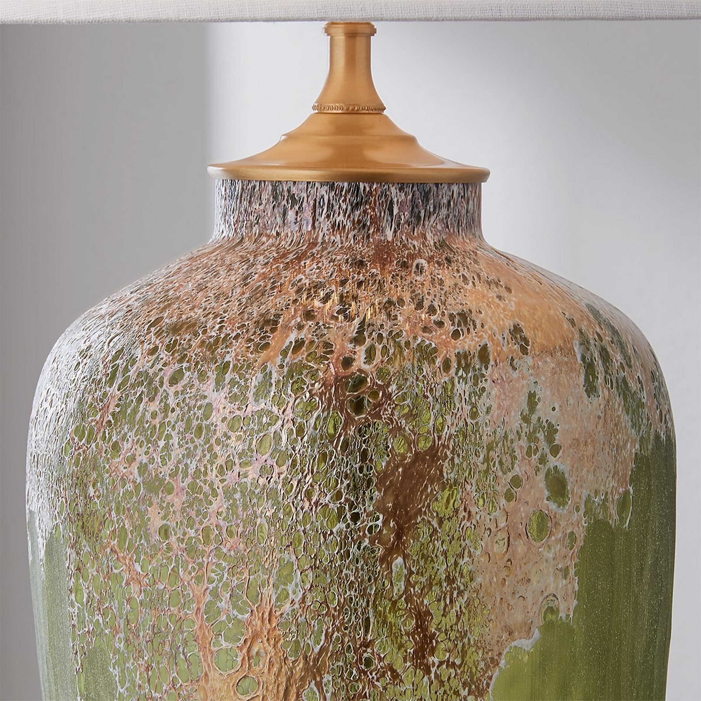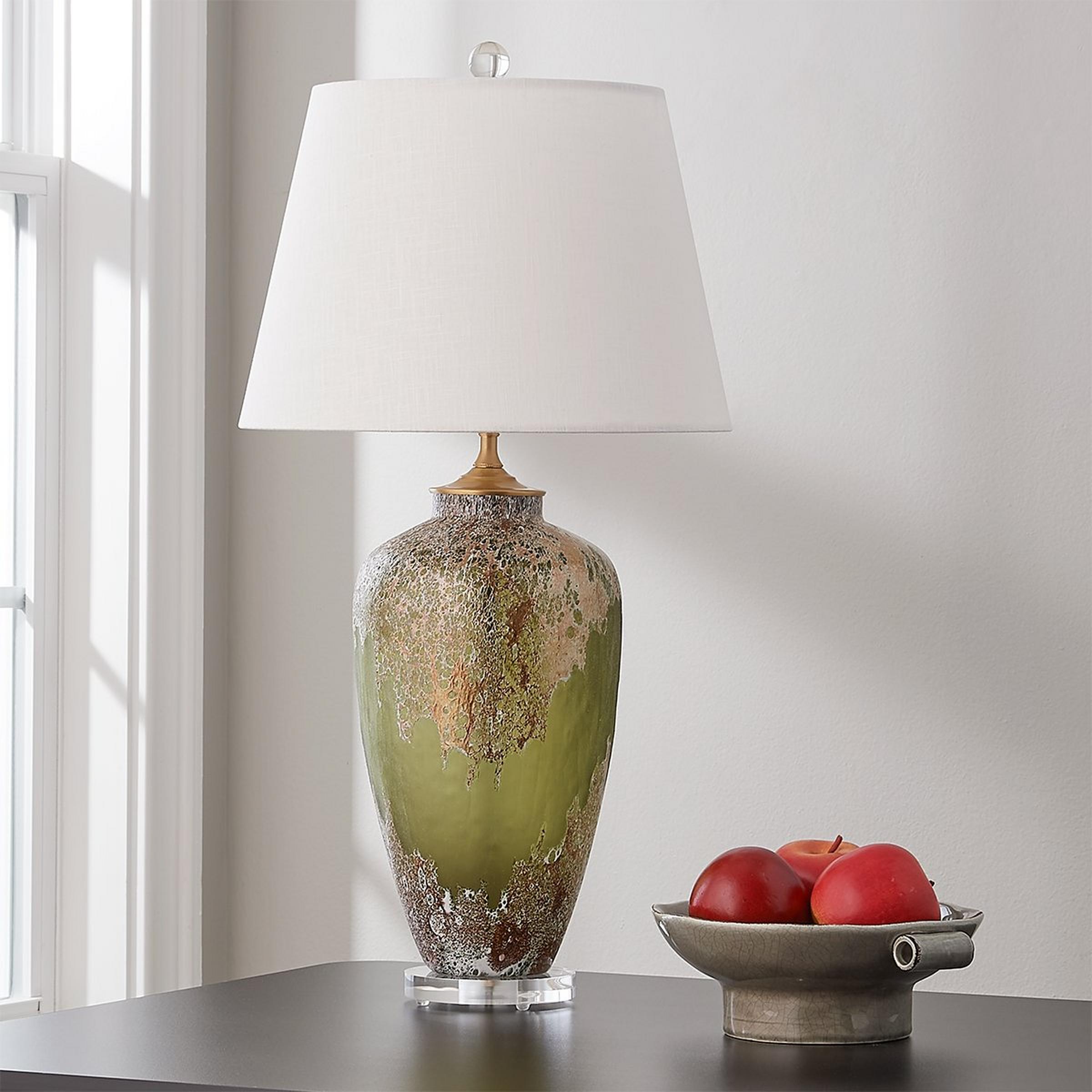 Crafted with care, the Lively Reef Table Lamp boasts a stunning green glass base that mimics the vibrant hues of underwater flora. Its textured lacing gracefully winds around the base, reminiscent of the delicate marine plants swaying in the ocean currents. This artistic touch adds a tactile dimension, inviting you to explore the lamps captivating details. This fixture is assembled by hand in our Richmond, Virginia production facility.