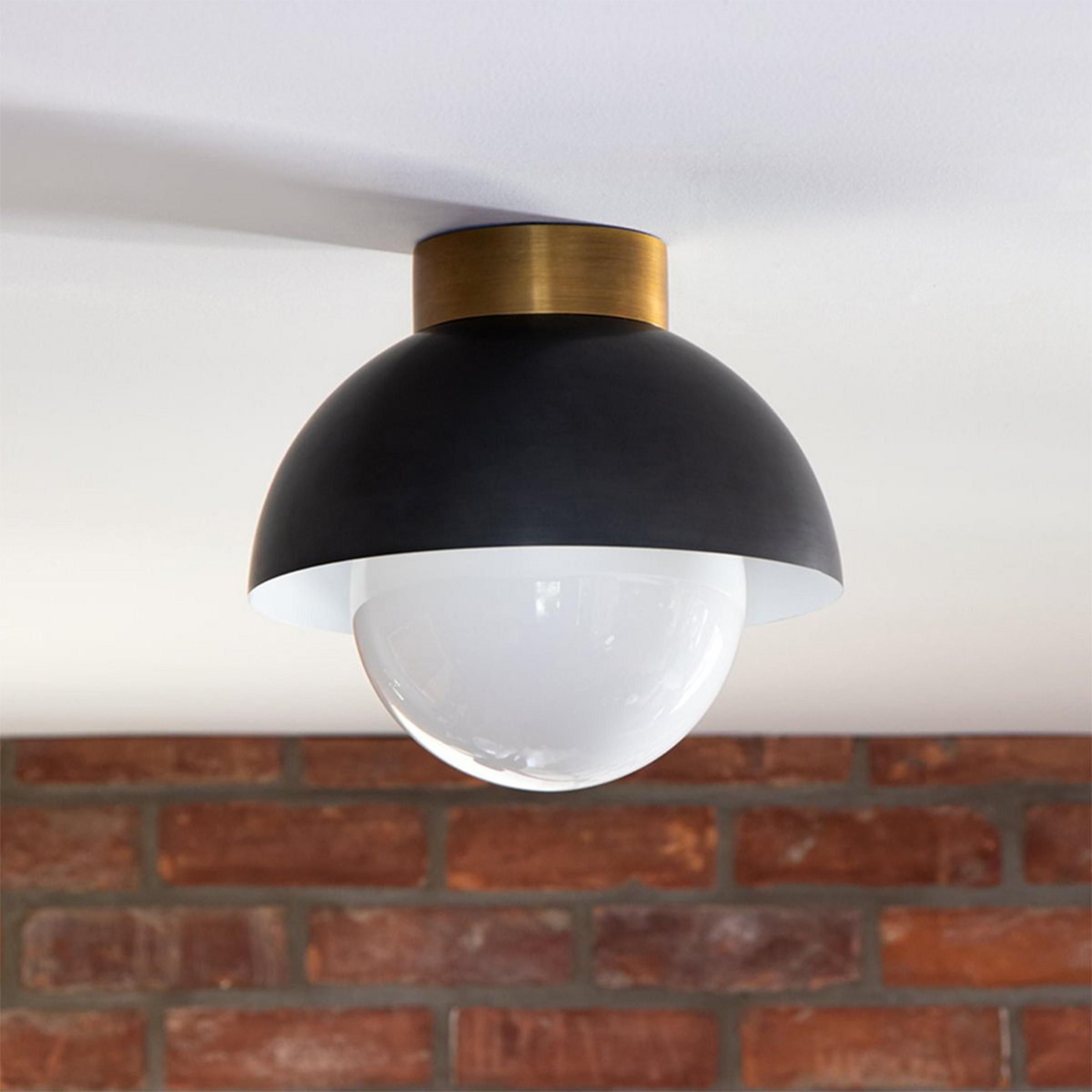 This unconventional ceiling light offers a fun and chic profile to place in those hard to decorate spaces. The metal dome paired with a white glass globe diffuses the glare and provides the perfect amount of downward lighting for closets, powder rooms, and hallways.