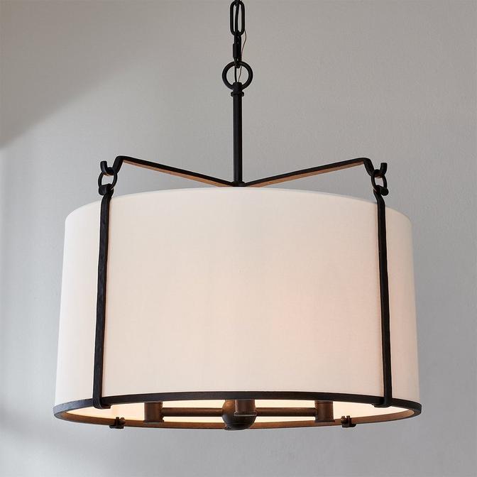 Dark Iron bands and rings, a white linen shade, and four candle lights create this popular look for today's elegantly simple style.