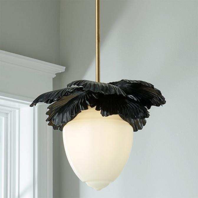 Petals cradle glossy white glass on this updated, colorful take on a classic convertible pendant light; it's perfect for a kitchen, hallway, or foyer in need of a classic, floral touch and versatile enough to be tucked up close to the ceiling. This decorative hanging light fixture, exclusive to Shades of Light, is assembled by hand in our Richmond, Virginia production facility. ONE AVAILABLE