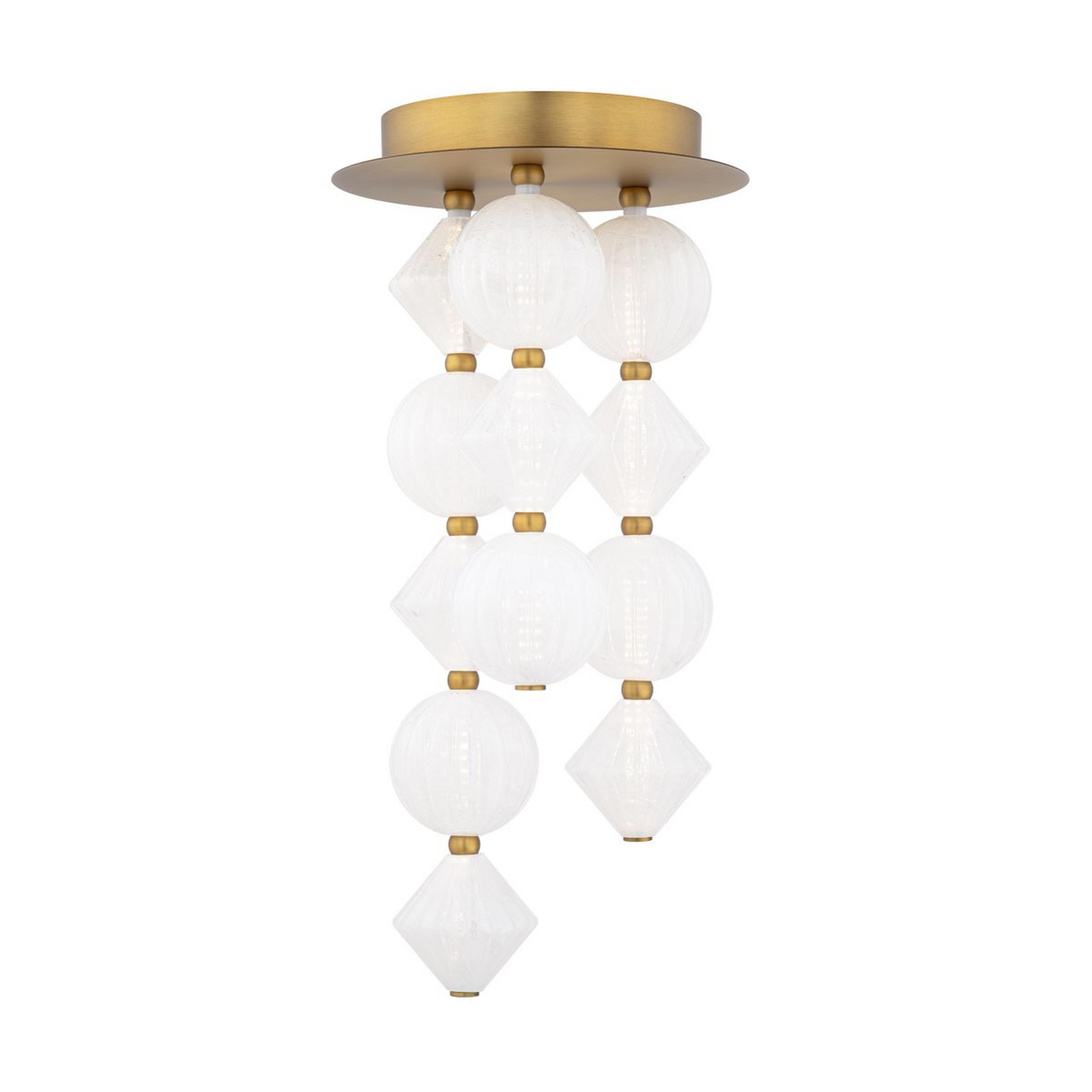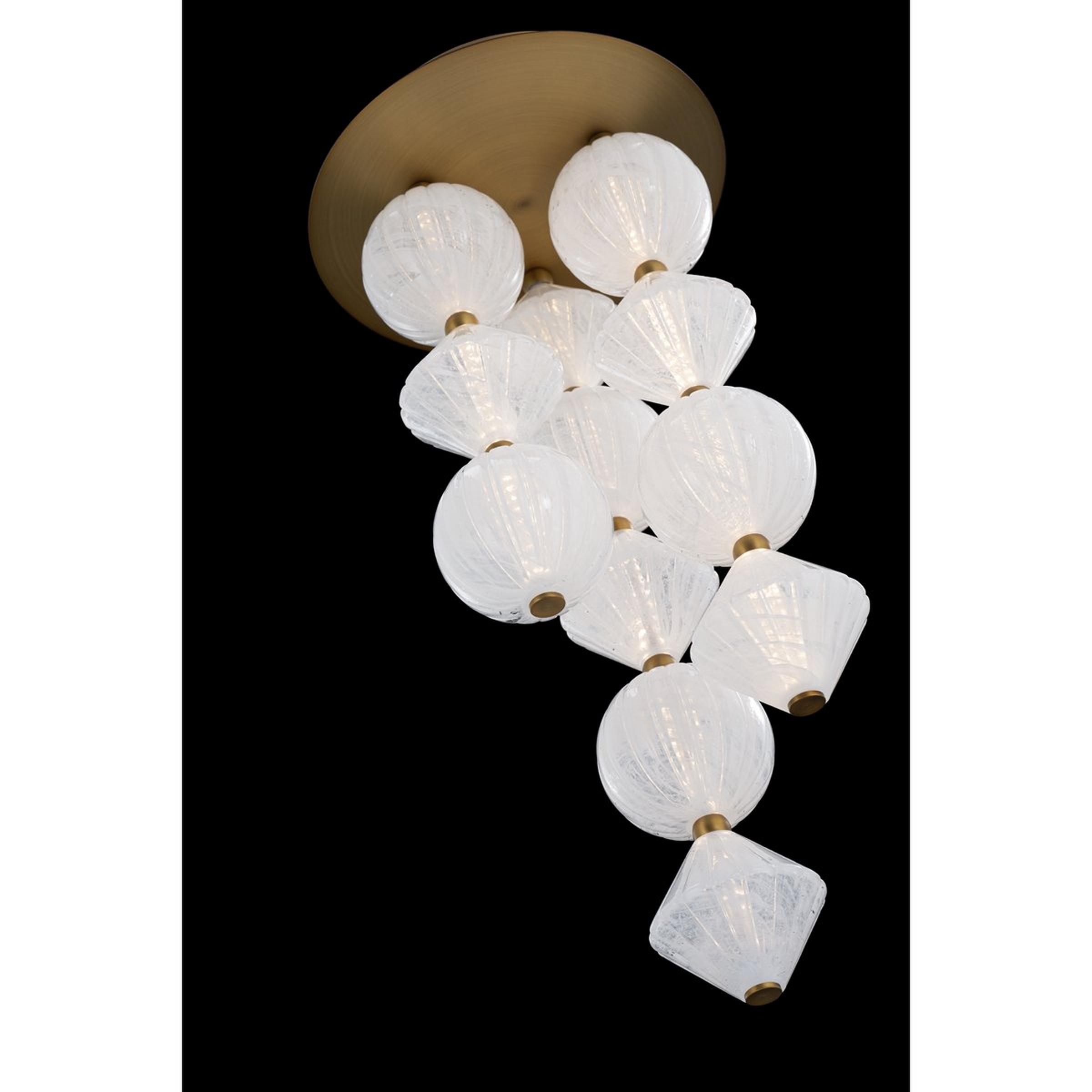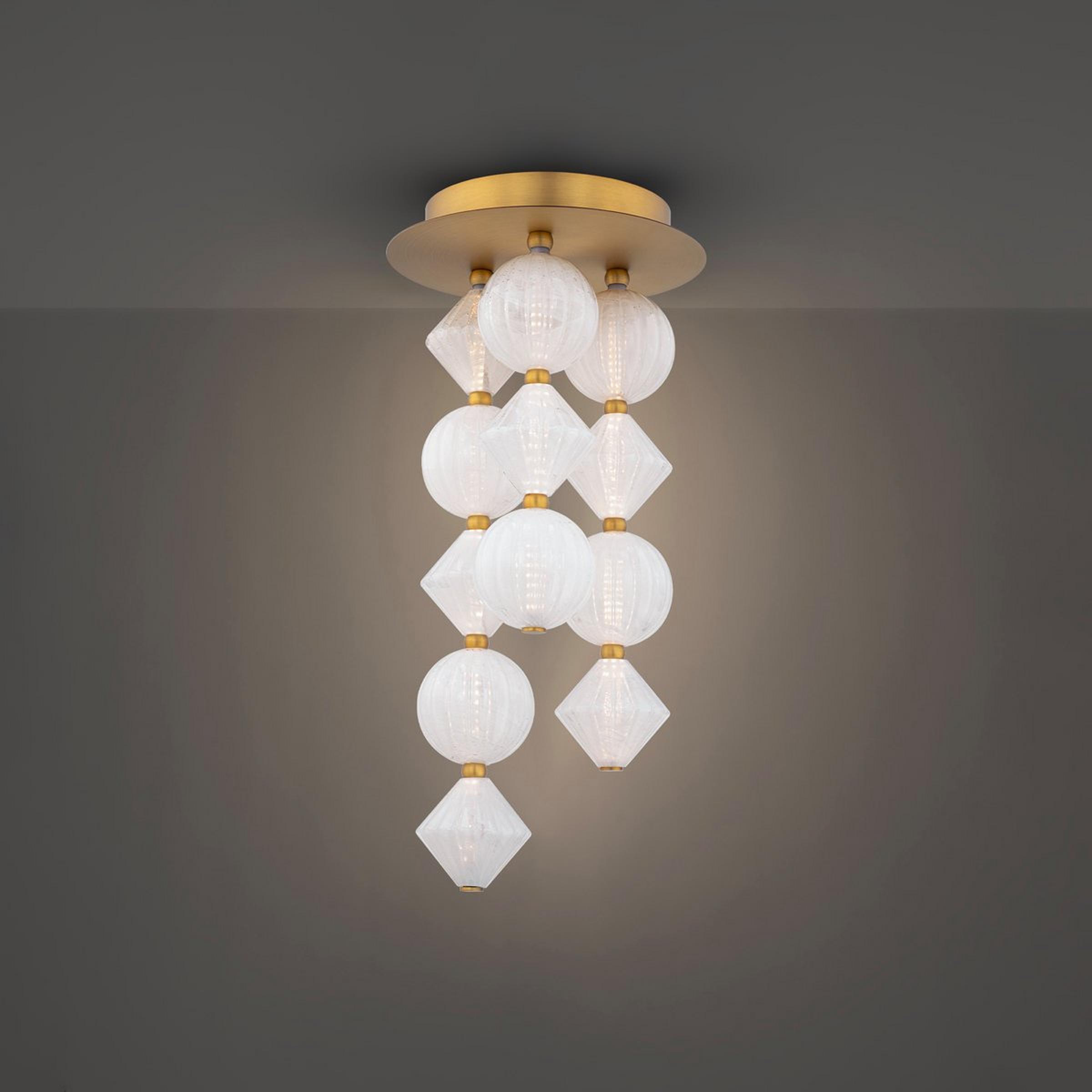 Experience the enchanting allure of handblown cloud glass, artfully crafted in a playful dance of diamonds and circles. This stunning ceiling light transforms any space, allowing its radiant beauty to cascade down and illuminate your room with an ethereal glow. The illuminated pieces are accented by metal connections that match the oversized canopy!