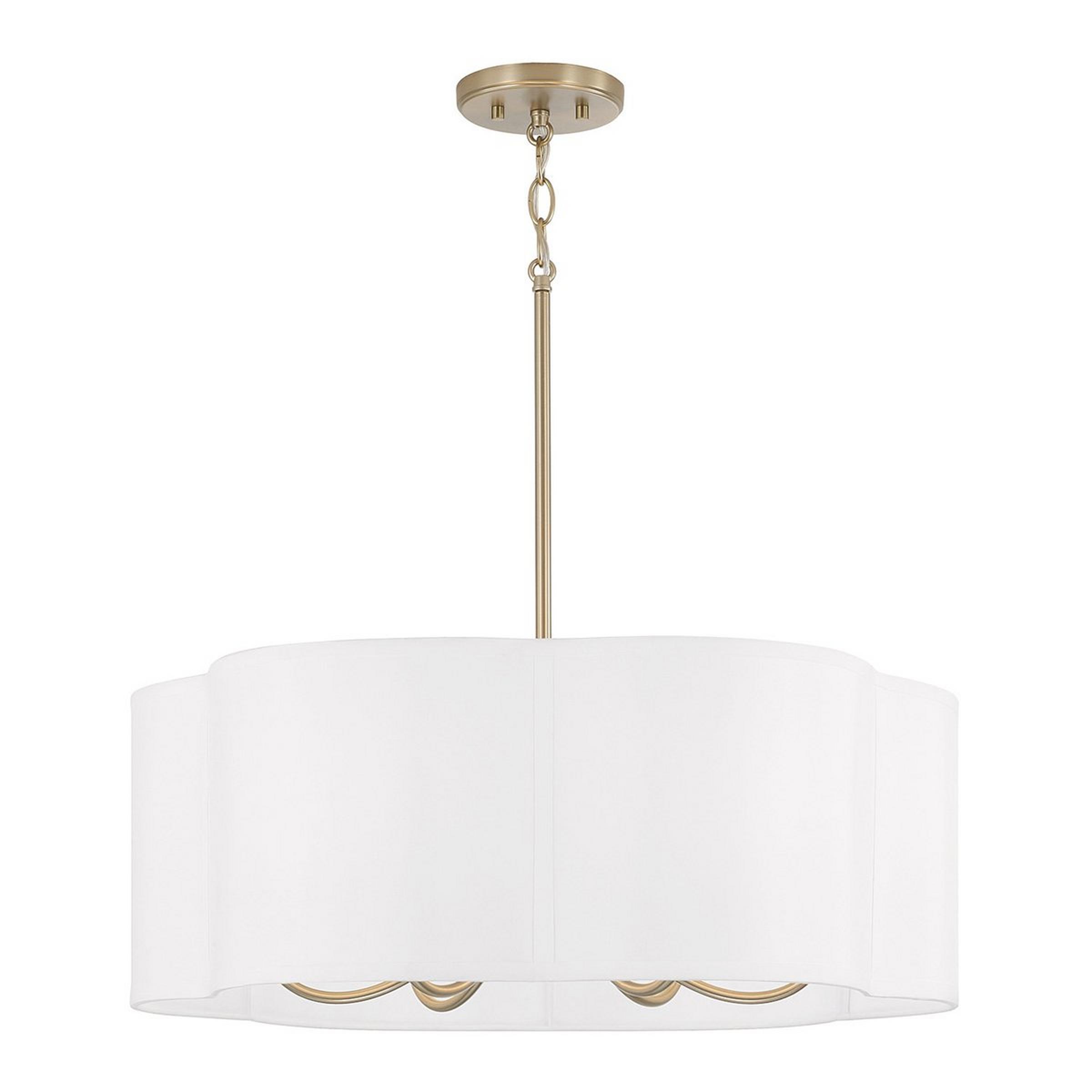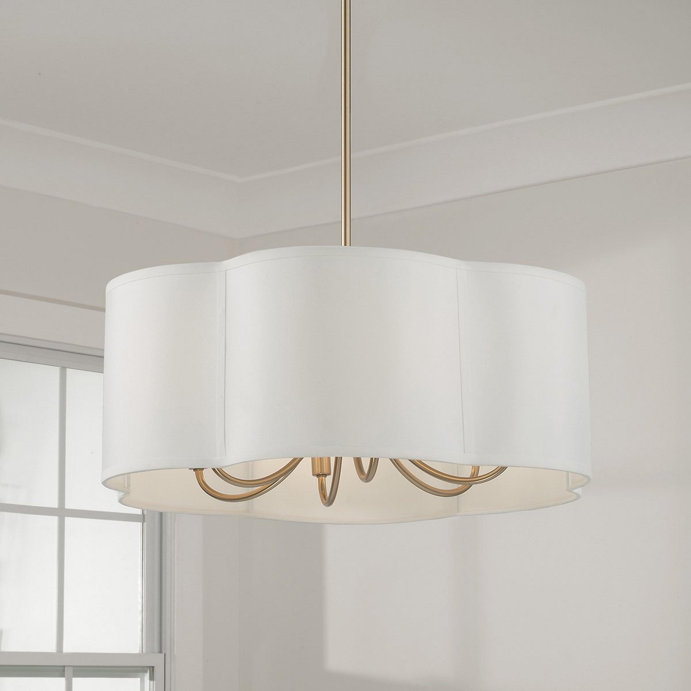 Dainty and playful, this Chandelier utilizes both swooping arms and a scalloped shade to add graceful style to a room. The cluster of candlestick lights, diffused by the shade, emit a generous ambient glow that feels both warm and inviting.