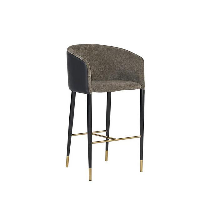 The thoughtfully mixed materials that comprise the Lyra Barstool bring eye-catching texture and refinement to kitchens and home bars. Soft but durable upholstery covers the seat of this chair, with contrasting faux leather wrapped around the barrel back. Black stainless steel legs with lightly distressed gold foot caps complete the look. Please note the faux leather used in this piece is manufactured to imitate genuine leather, and as such, variation in color, texture, light scratching, and other markings should be expected and celebrated. The gold foot caps will also display obvious and intentional signs of wear, such as light scratches and a brushed finish. No two chairs will be identical, adding to the unique allure of this piece.