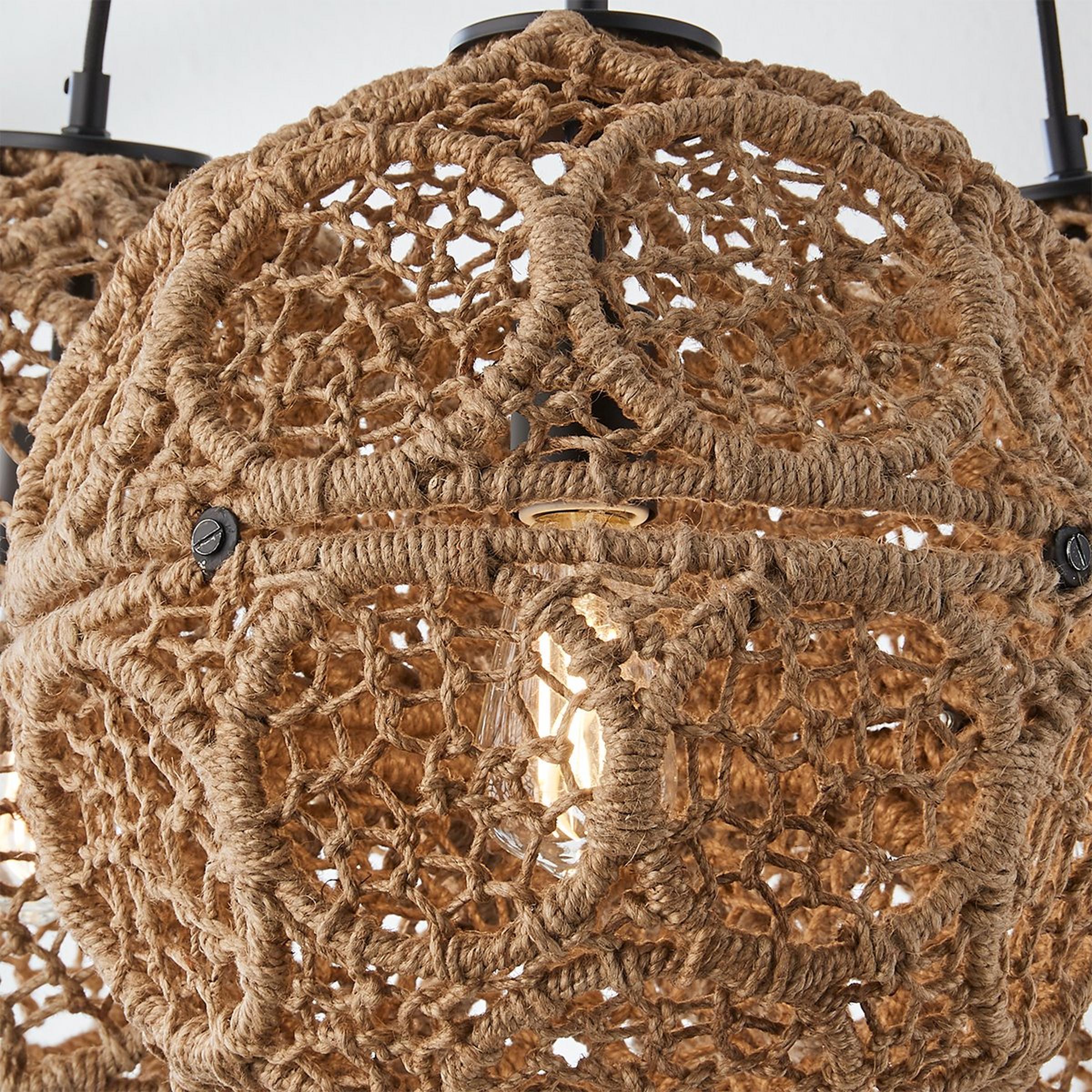 Three spheres of recycled metal and jute rope woven into macrame webs create this lovely cluster chandelier. The intricate pattern is well constructed and portrays a delicate lace design. Because of the nature of natural materials, variations in color, pattern, and texture should be expected and celebrated; no two pieces are exactly alike, making each of these lovely fixtures truly one-of-a-kind! This fixture is assembled by hand in our Richmond, Virginia production facility.