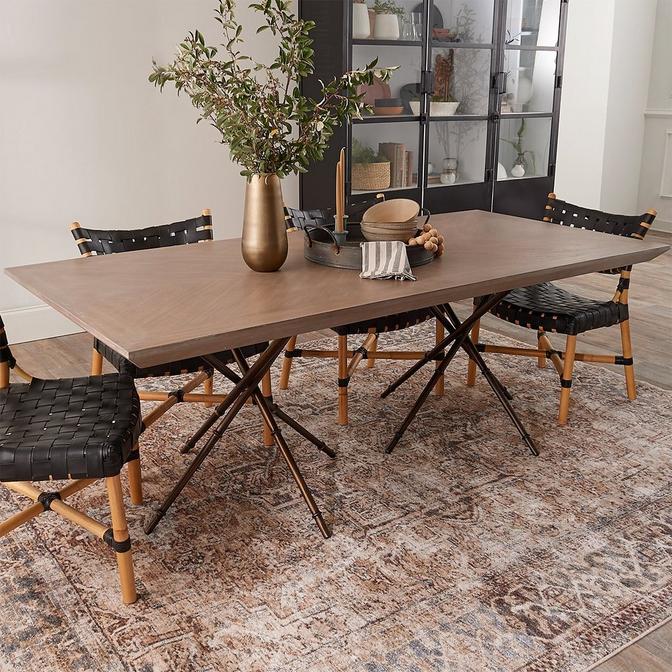 This super sleek modern dining table adds architectural intrigue with a series of metal supports crossed to created the angular legs.