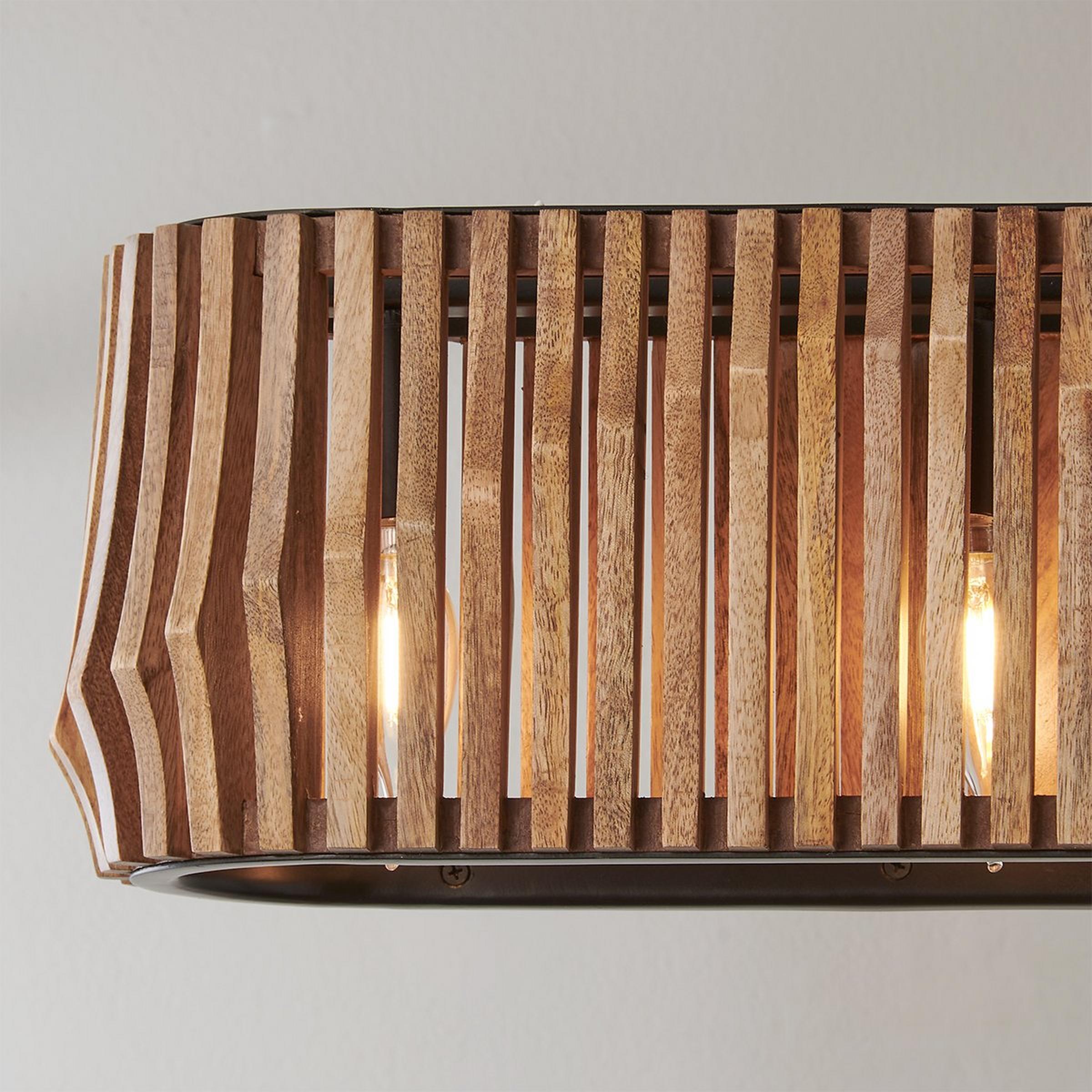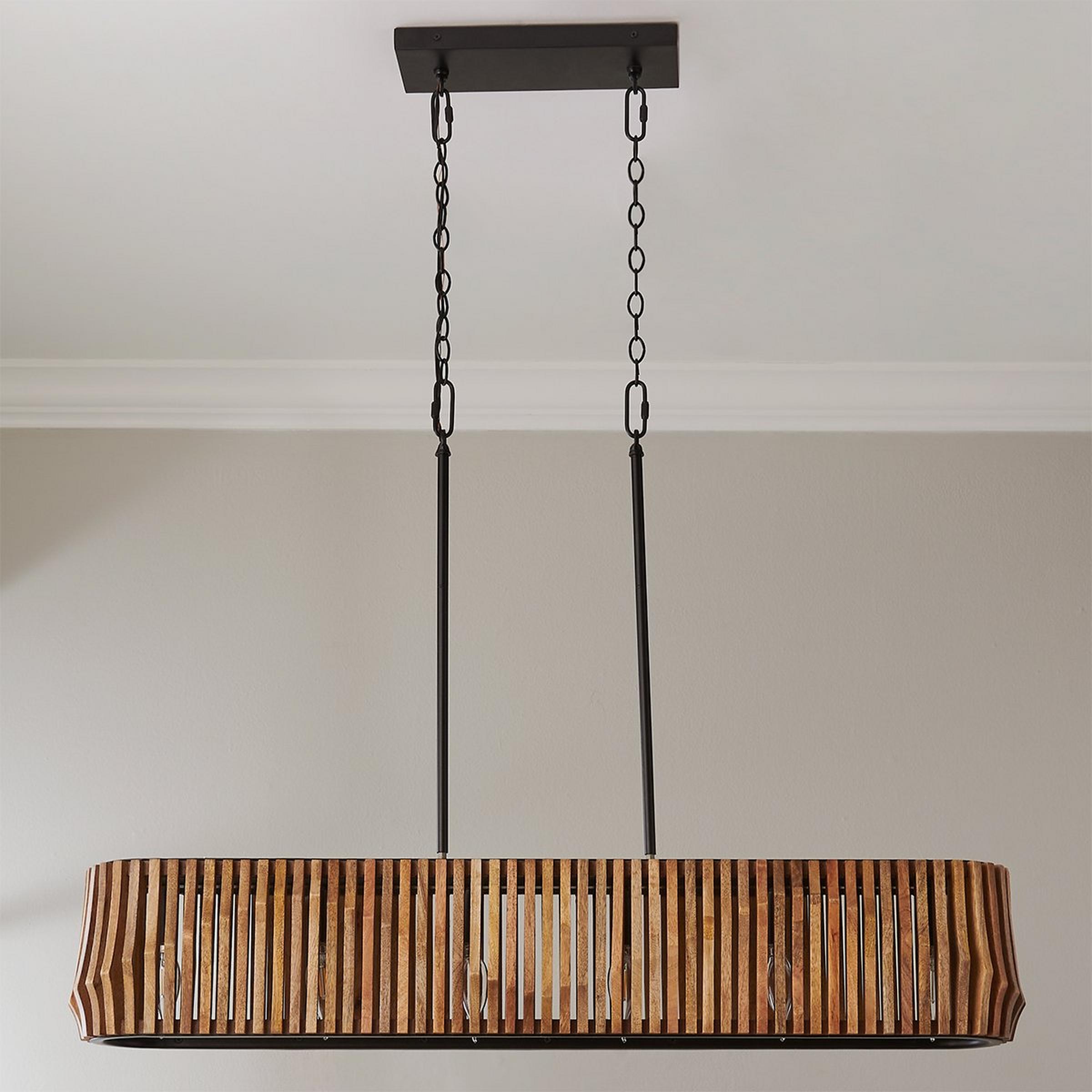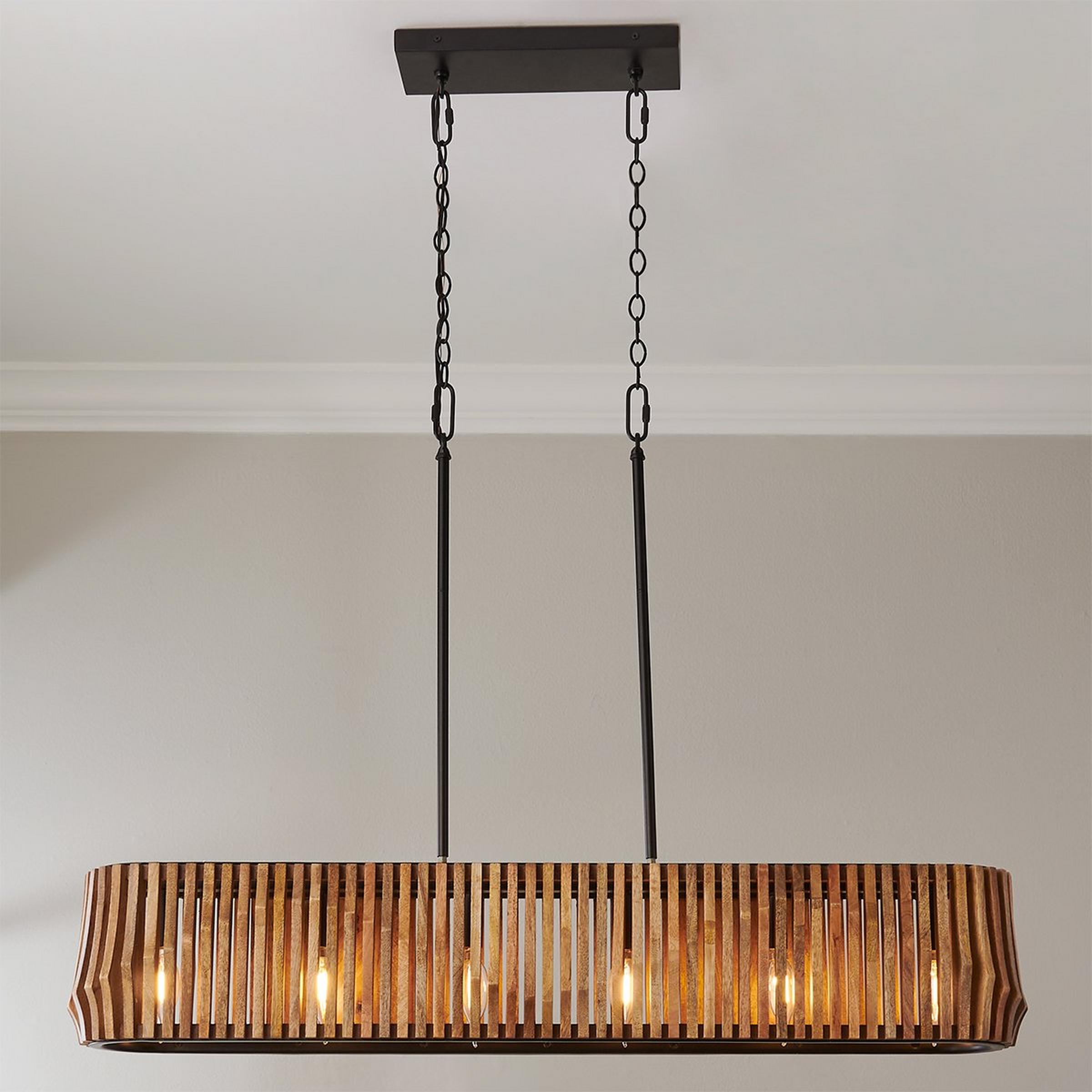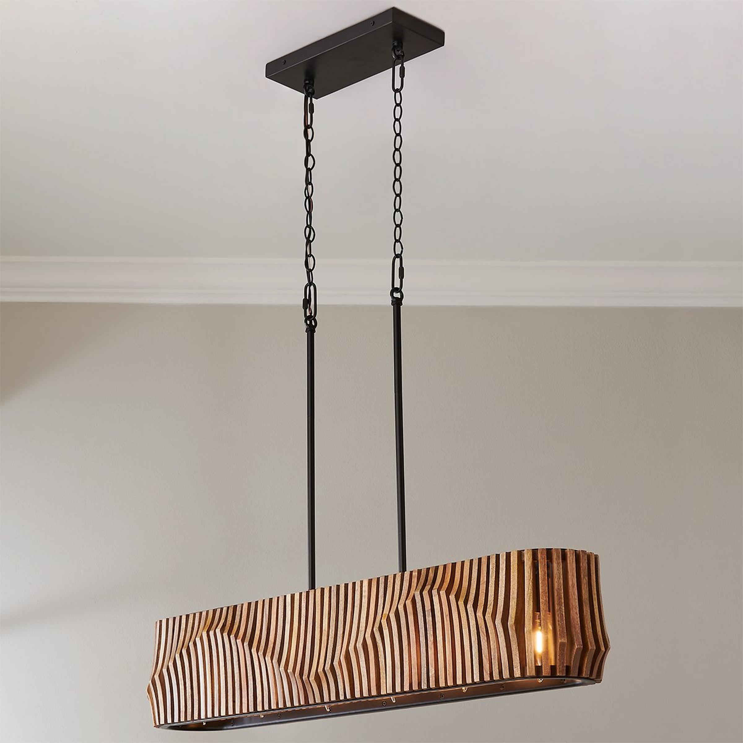 Carefully curated, individual mango wood slats form this sculptural island chandelier. With each piece of wood having a unique bent design, the finished product gives the illusion of movement, like a wave. The handcrafted nature of this light may result in minor variations making each fixture one-of-a-kind!