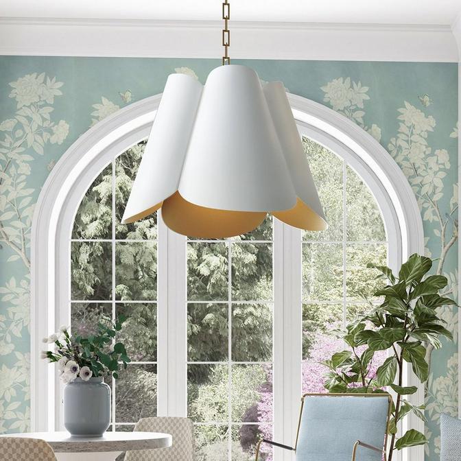 This minimalistic ceiling light shines both upward and downward from within an opaque metal shade. It has a scalloped shape that dovetails nicely with classic furniture and other traditional finishes while keeping a room looking fresh and tidy.