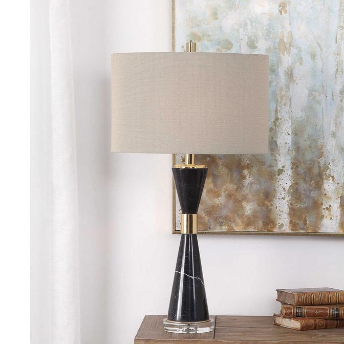 A beautiful, hour-glass figure is presented in our Marble Corset Table Lamp. The body is constructed from a sleek, black marble and accented with gold and crystal detailing. With a mid-century flair, feature this fixture with stylish living room decor.