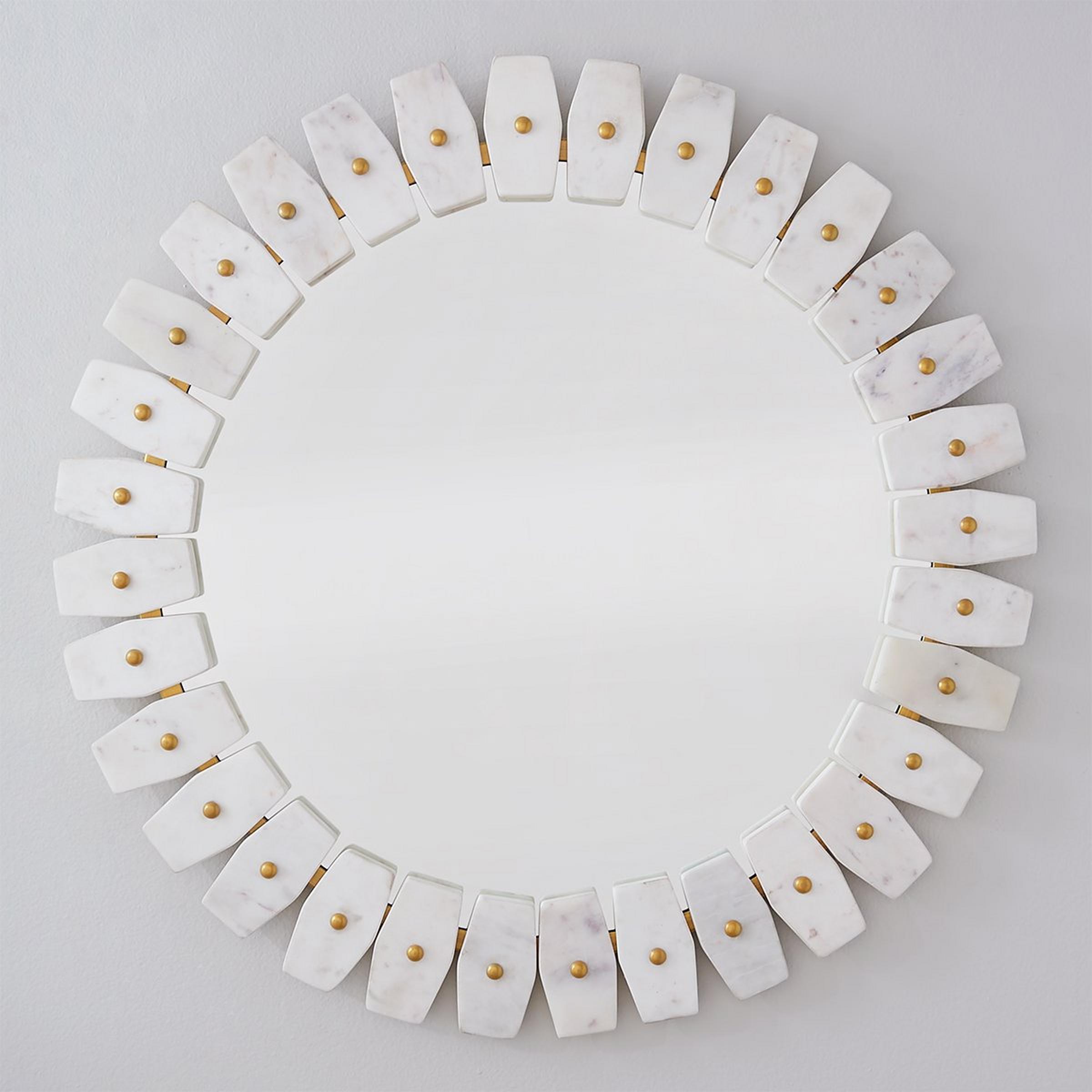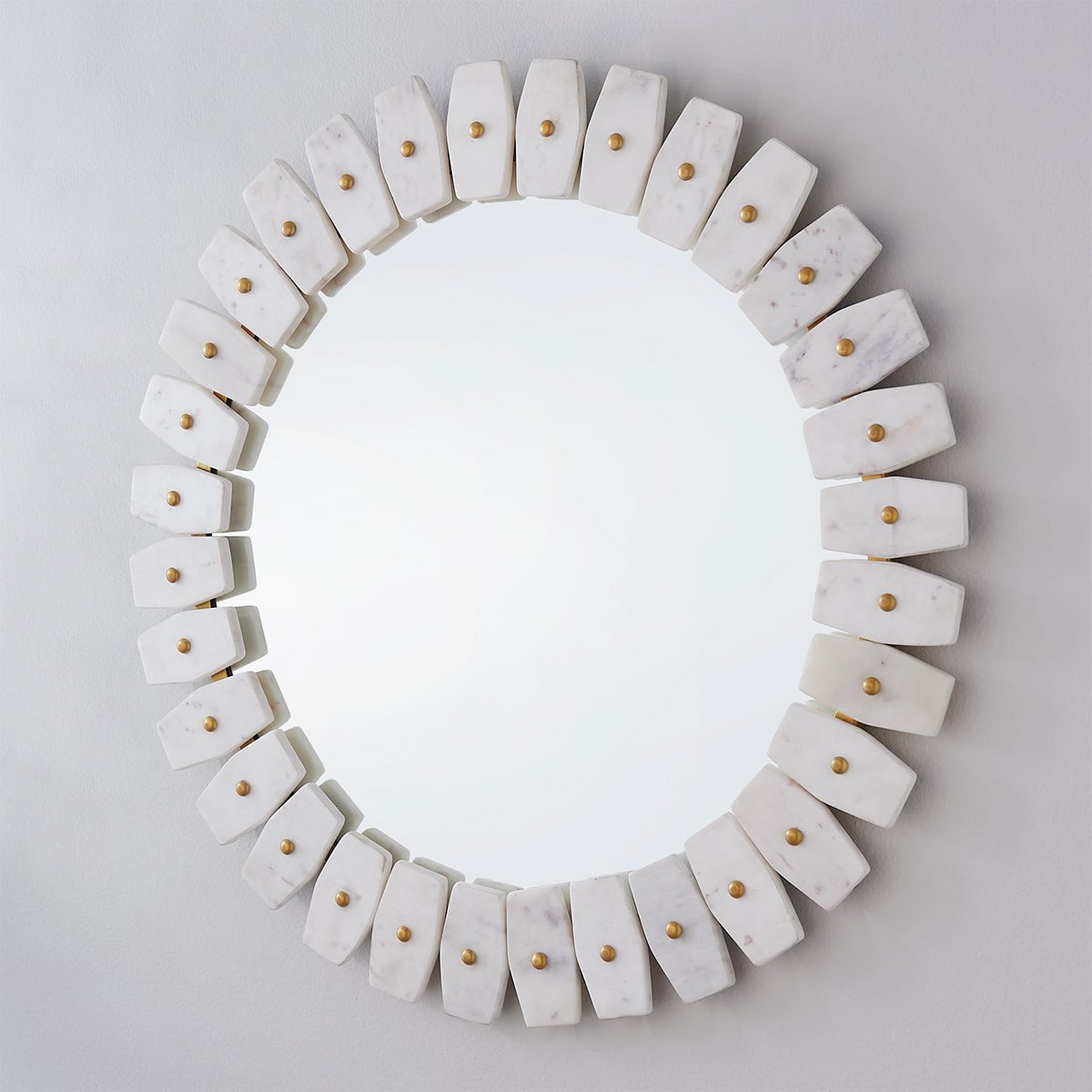 Rare in style yet high in quality, our Marble Domino Mirror has an intriguing design to dress up your modern bathroom. The tiles of marble around the rounded mirror are nailed to a thin brass border that peeks through. Sophisticated and refined, this mirror will pop with the rest of your interior design scheme.
