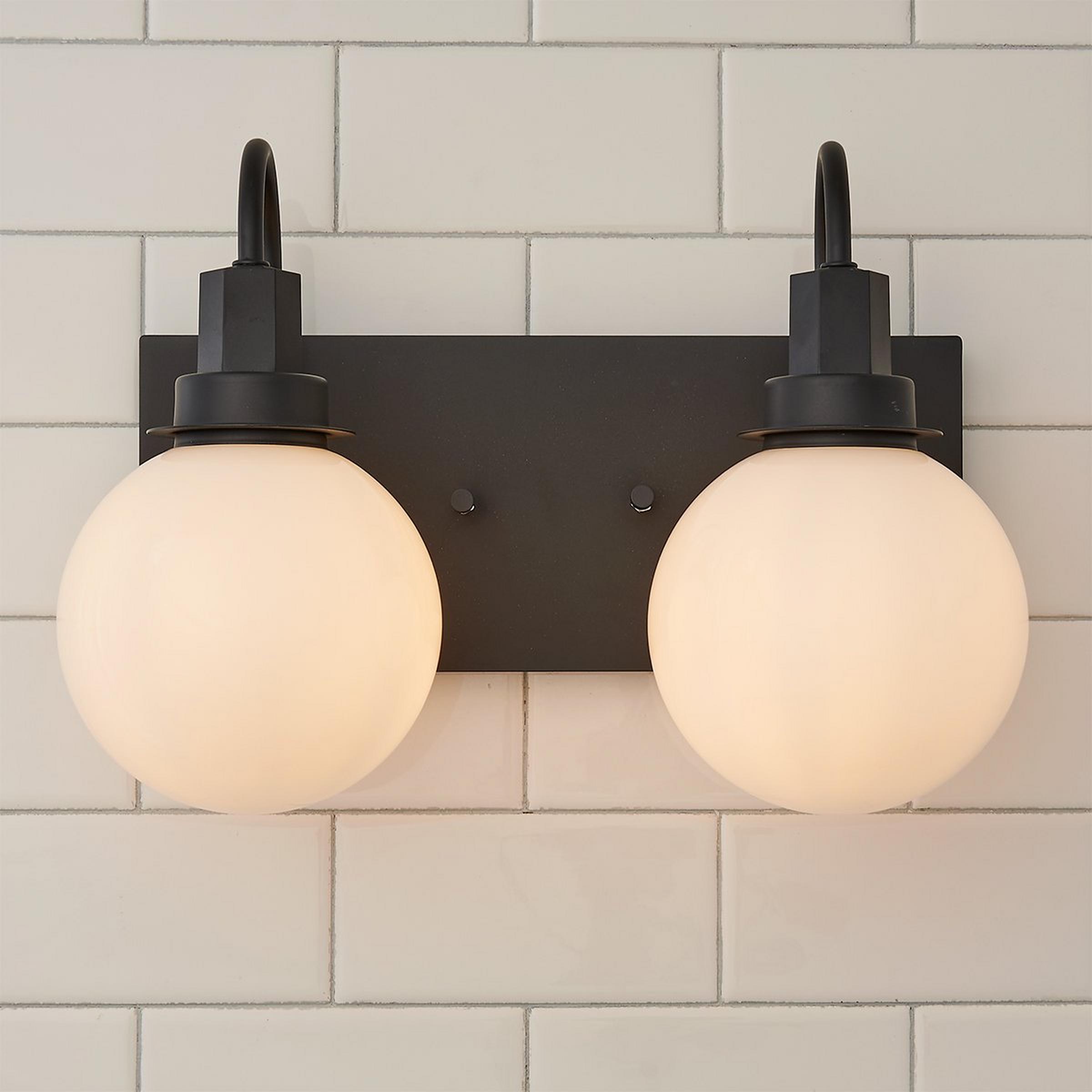 The sweeping gooseneck connecting the hexagonal hardware gives complexity to a seemingly minimal vanity light. The uniform metallic finish produces a beautiful accompaniment to the opal glass globes' focal point. With its clean design, Maren proves that less is more.