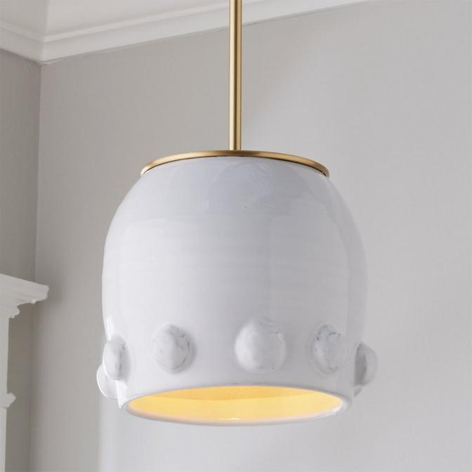 Textured, distressed white pottery is gives this whimsical pendant a rustic, bohemian edge. Perfect for counterbalancing the clean lines of the solid brass hardware. Perfect repeated over an island, or over a small table. This pendant is assembled by hand in our Richmond, Virginia production facility with solid brass hardware. Due to the nature of this rustic pottery, no two will be exactly alike in color, size or pattern.