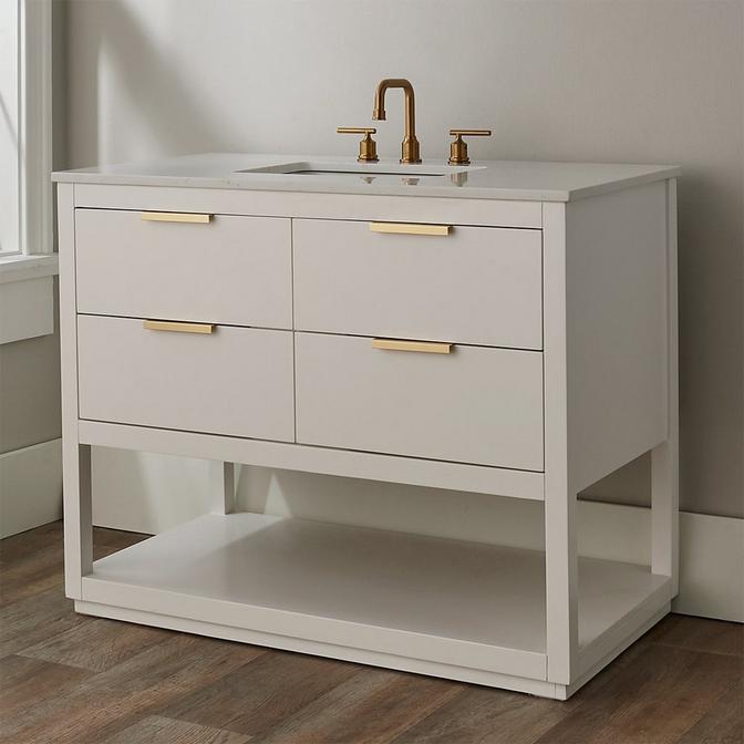 The Marr Vanity is sleek and modern, offering a hint of sophisticated glamor to any contemporary bathroom. With four soft close drawers and an open shelf base, there's plenty of room for storage, making this piece as convenient as it is stylish. Please note that because quartz is a natural material, variations in color, finish, and veining should be expected. Countertop measures .71" tall.