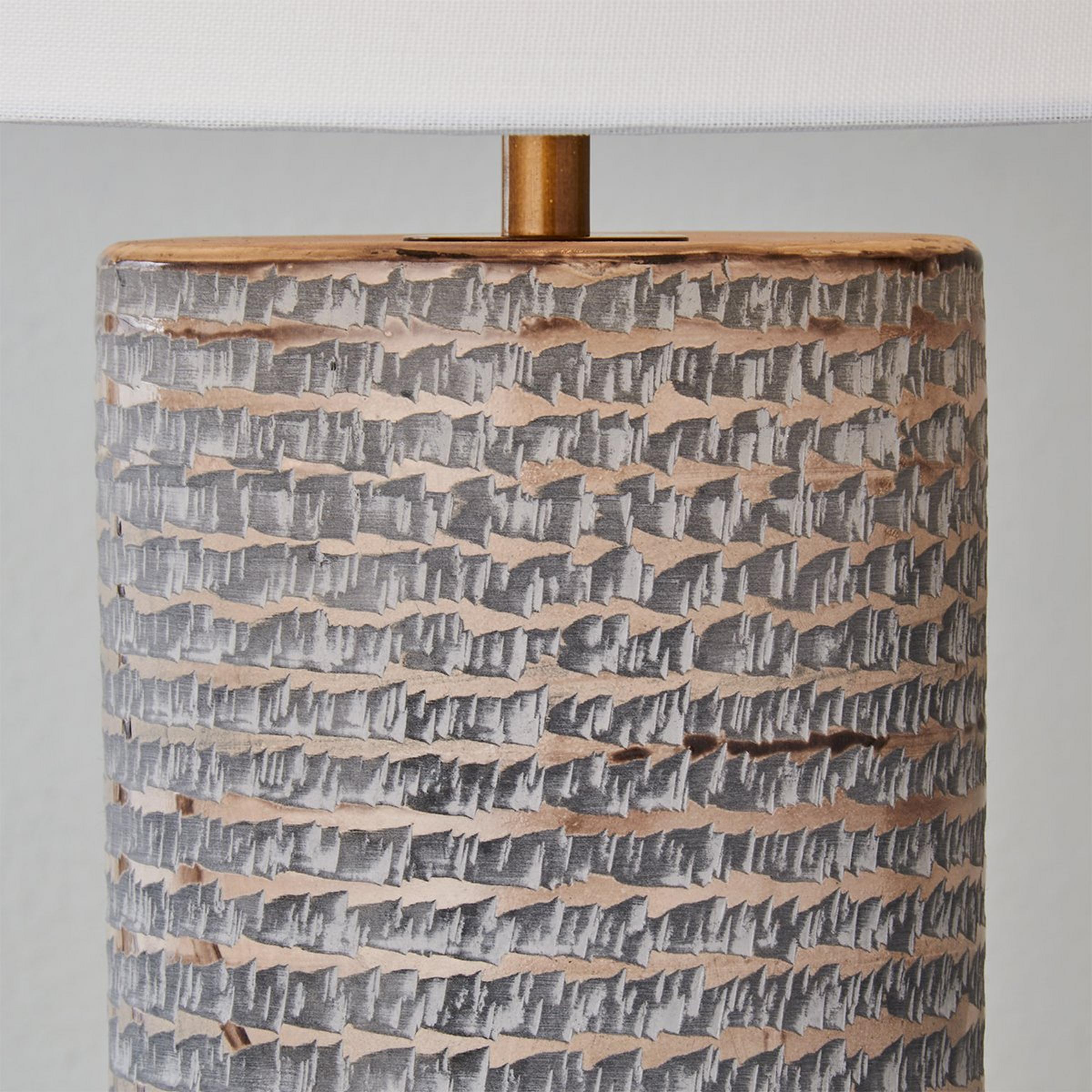 The Maverick Table Lamp showcases neutral tones to blend in with any decor style. The ceramic base displays carved accents of gray and sepia for a sophisticated rustic appeal. The white fabric drum shades seamlessly compliments the the artistic base.