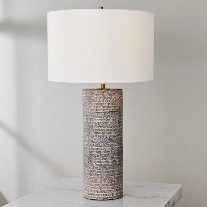 The Maverick Table Lamp showcases neutral tones to blend in with any decor style. The ceramic base displays carved accents of gray and sepia for a sophisticated rustic appeal. The white fabric drum shades seamlessly compliments the the artistic base.