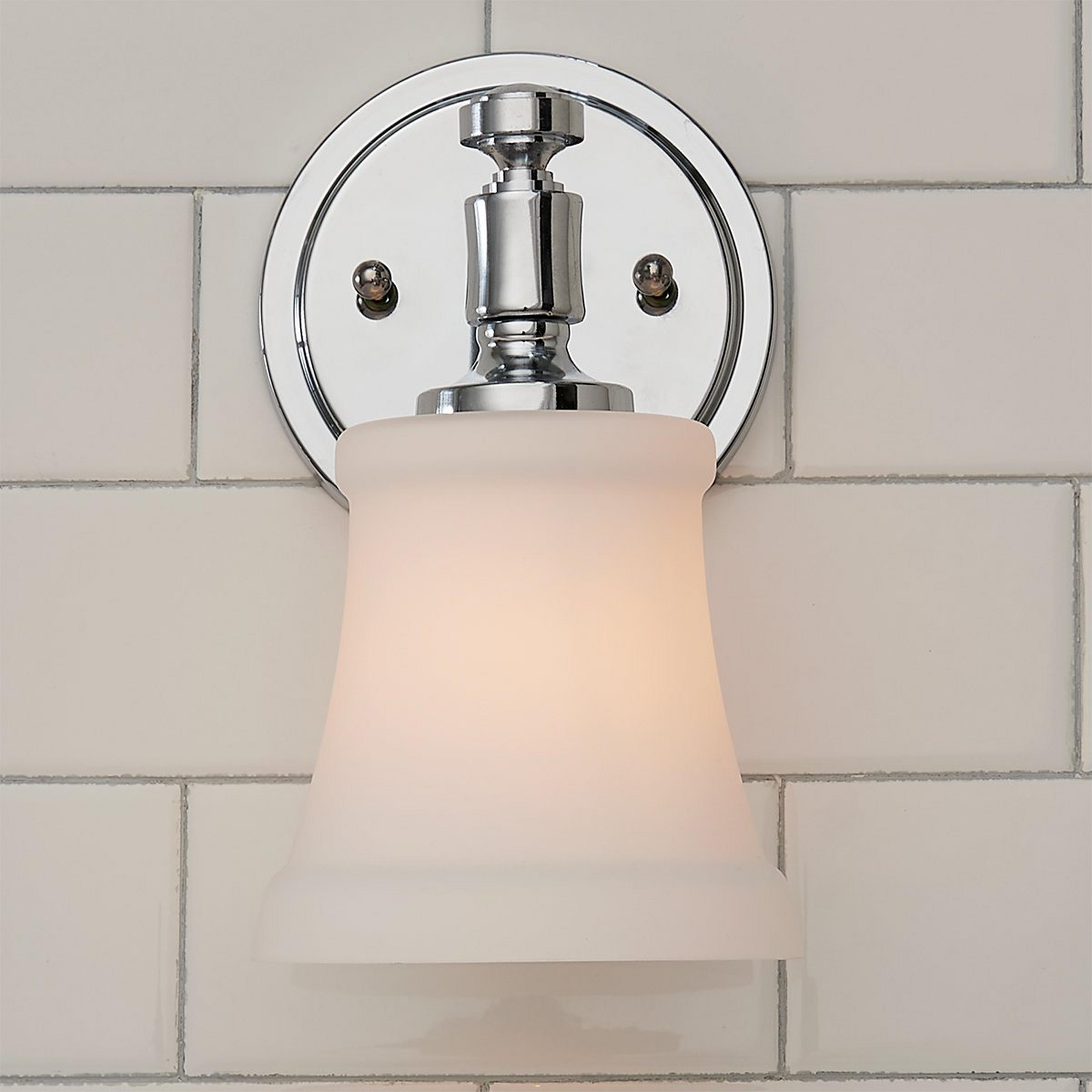 Showcasing classic style with refined details, this bath sconce will brighten your bathroom with a soft glow from the white glass shade.