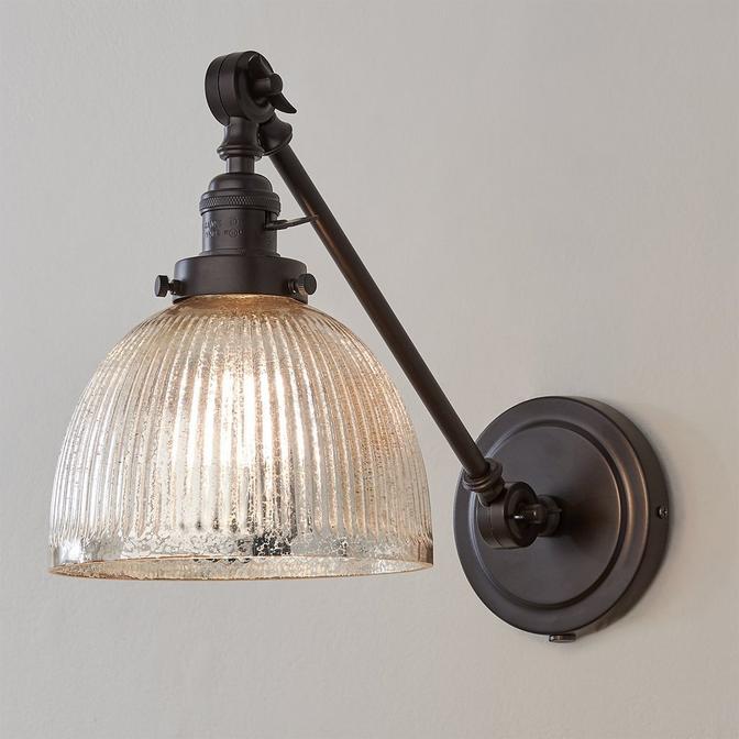 This wall sconce features thick dome shaped mercury glass beneath retro inspired hardware in your choice of Polished Nickel, Oil Rubbed Bronze, or Satin Brass. Adjustable arm swivels up and down at backplate and above shade. Also features an on/off switch on socket. Add our "Edison Bulb" for added vintage appeal.100 watt max medium base. 5" backplate. 12.5" from swivel to swivel. Swivel to bottom of shade holder is 4.75" in length. Shade dimensions: (5.5"Hx7"W). Optional plug-in installation is possible using included matching metal 30" long cord covers (two connecting covers, each is 15" long) and 10' of wire.