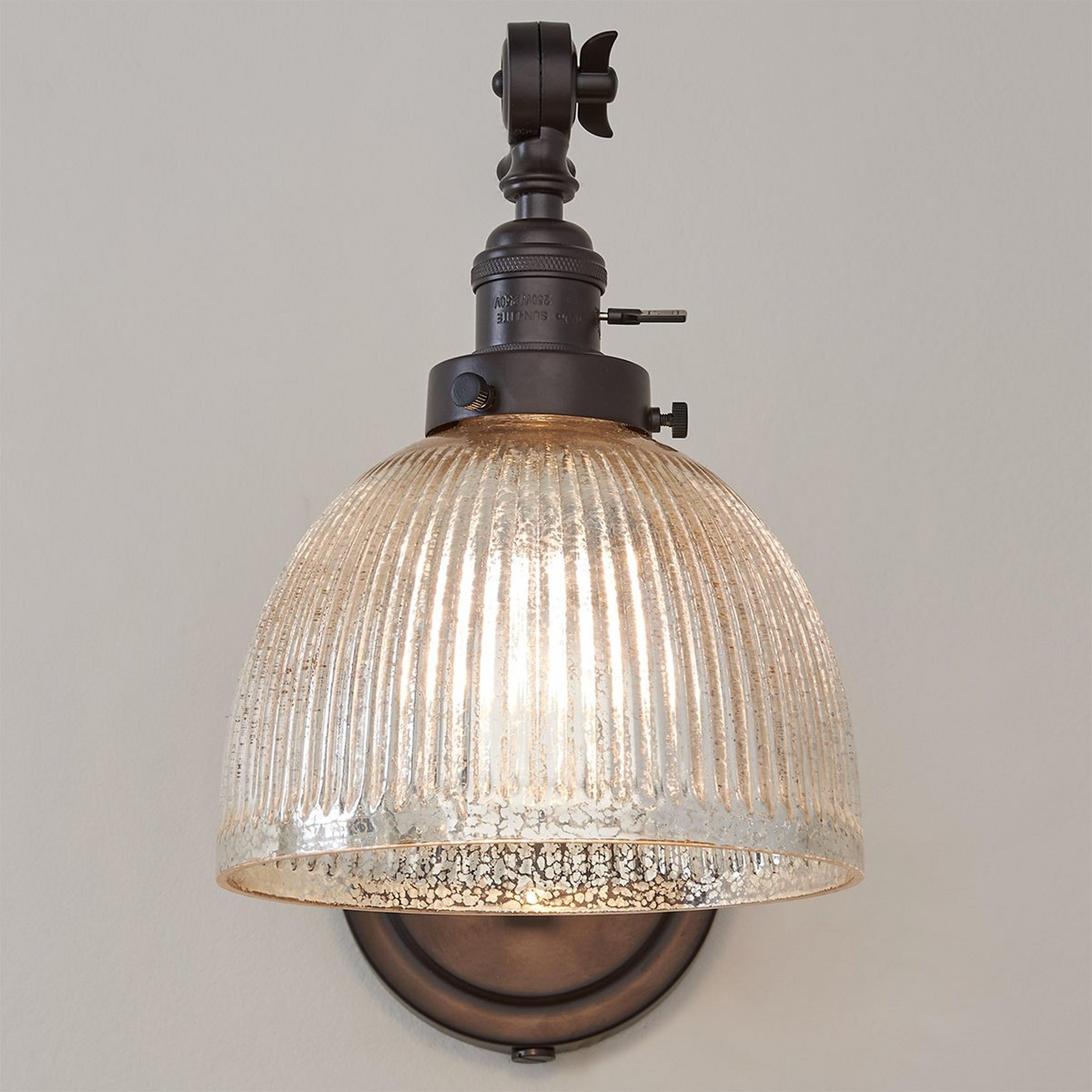 This wall sconce features thick dome shaped mercury glass beneath retro inspired hardware in your choice of Polished Nickel, Oil Rubbed Bronze, or Satin Brass. Adjustable arm swivels up and down at backplate and above shade. Also features an on/off switch on socket. Add our "Edison Bulb" for added vintage appeal.100 watt max medium base. 5" backplate. 12.5" from swivel to swivel. Swivel to bottom of shade holder is 4.75" in length. Shade dimensions: (5.5"Hx7"W). Optional plug-in installation is possible using included matching metal 30" long cord covers (two connecting covers, each is 15" long) and 10' of wire.