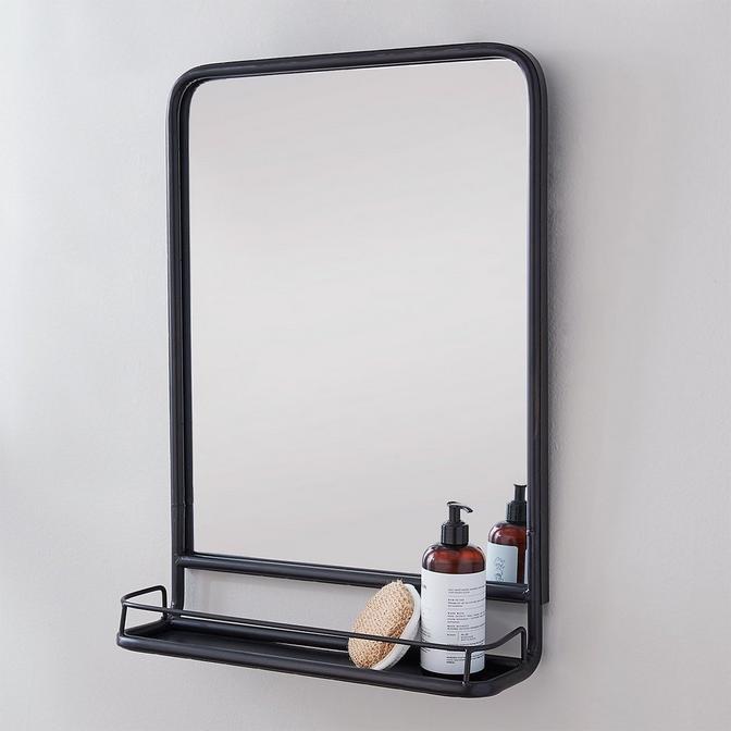 This sturdy, functional industrial mirror with built-in shelf is a great storage idea for a small bathroom vanity or bedroom where it can accommodate toiletries. The vertical rectangular wall mirror's shelf also provides display space for decorative accents when placed more prominently in an entryway or other room where guests will see it. A sturdy metal frame dressed in a classic finish surrounds the mirror. 4" deep storage shelf.
