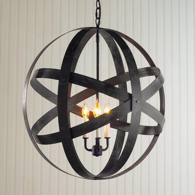 Aged metal straps in orbit form this modern industrial inspired lantern. Aged iron straps can be adjusted individually to your desired design. Illuminated within from a 3 light cluster, the sphere glows with sleek "salvage" appeal.