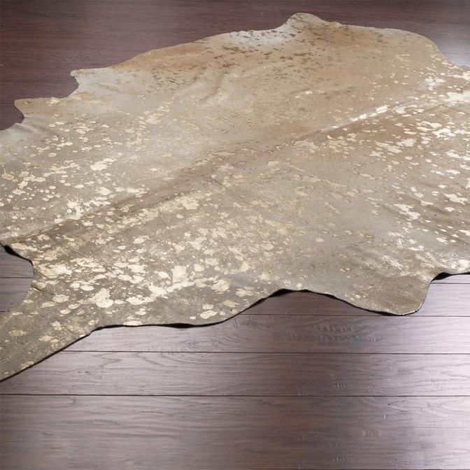 Metallic overlays on acid-washed cowhide brings new meaning to upscale chic! These are the finest colored cowhides with short shiny hair and supple, soft leather, tanned and handpicked in Brazil. Available in White & Silver Metallic, Beige & Silver Metallic, or Beige & Gold Metallic. Measured from the hindquarters to the nape of the neck, apx. size is 6' x 8'. Natural variations in hides are to be expected and appreciated. Imported.
