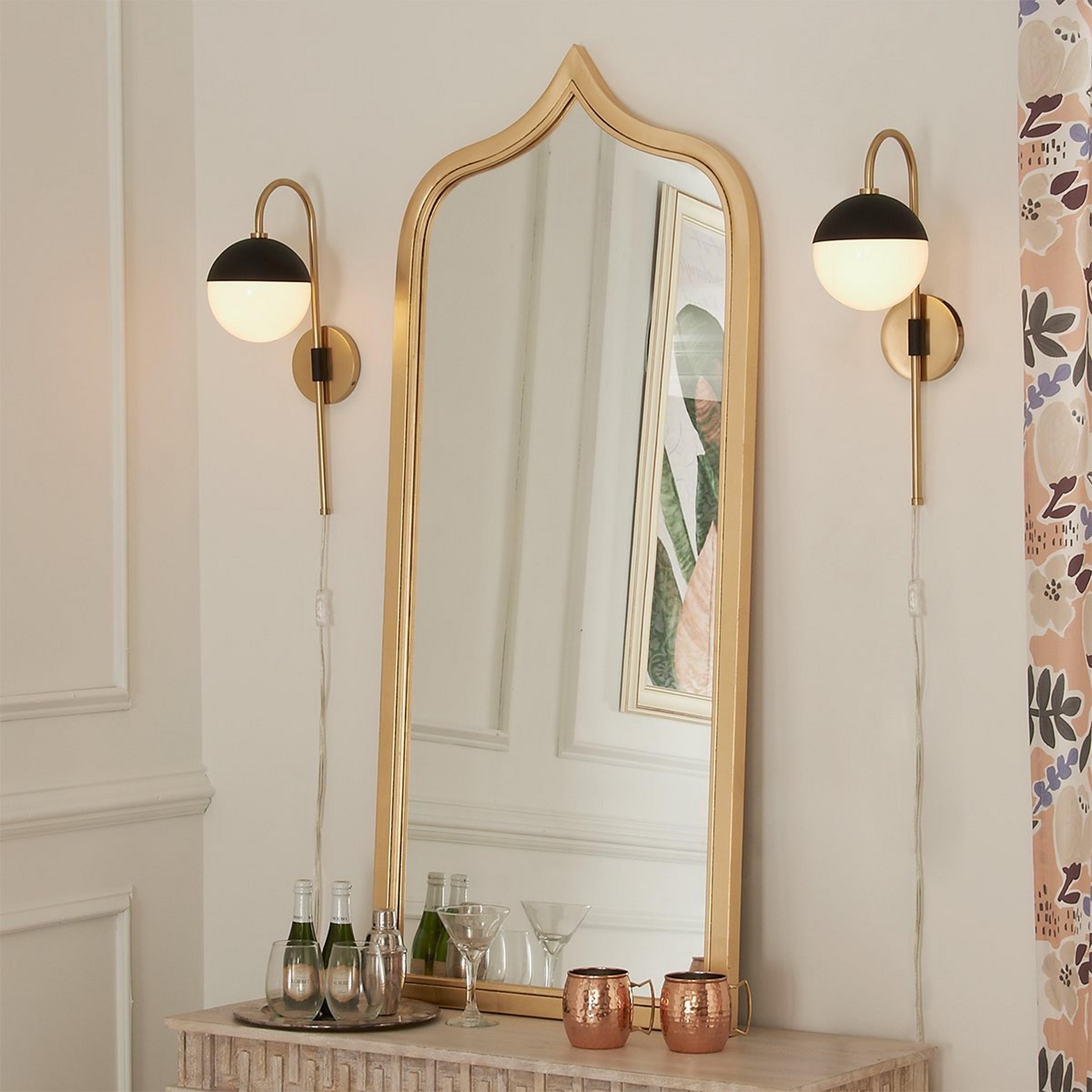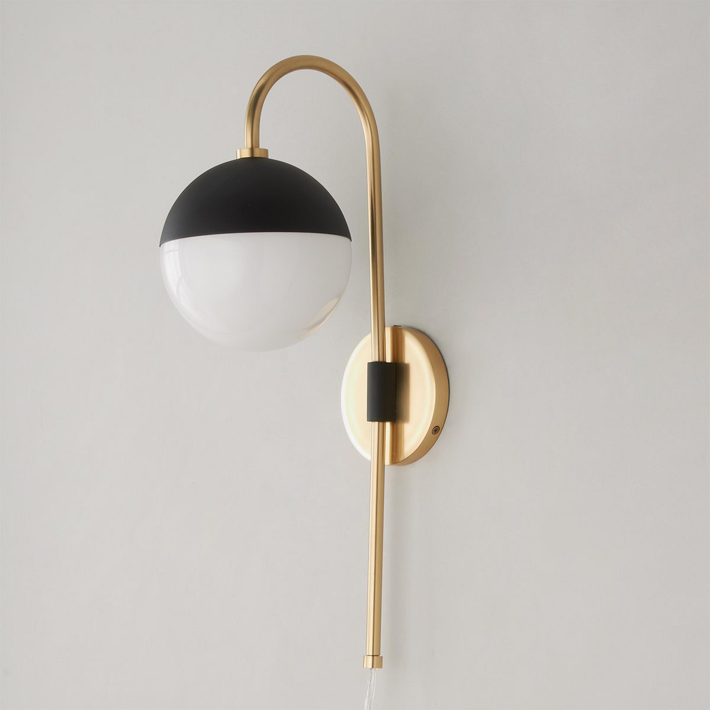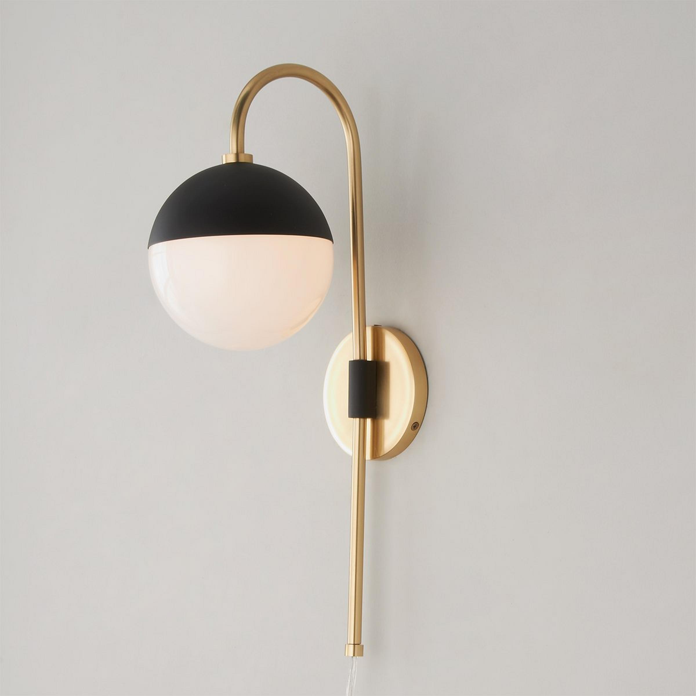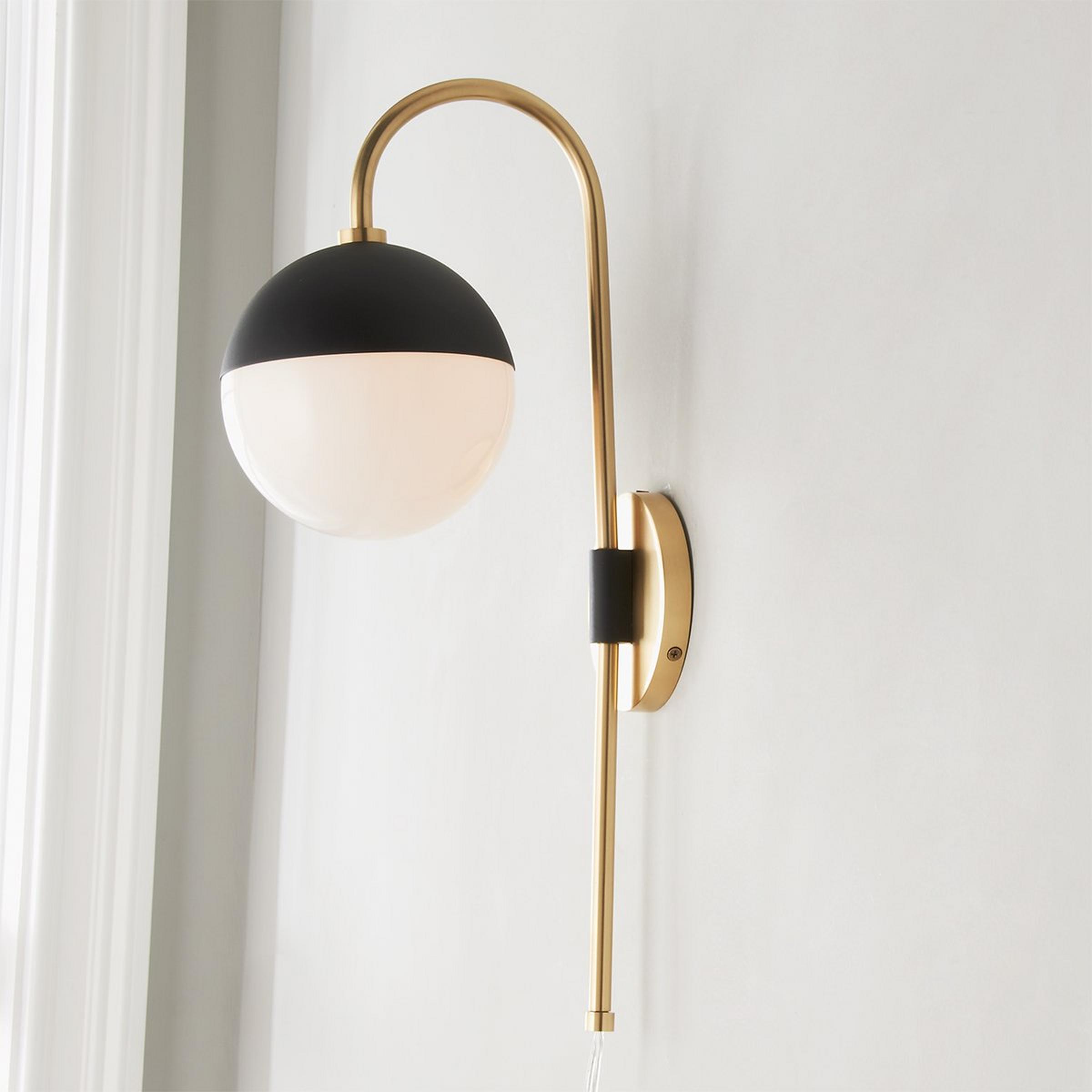 Chic modern style, quality craftsmanship and functional elements make this adjustable arm wall sconce one of our favorites! The glossy opal glass dome is surrounded by a matte black metal dome while a gooseneck arm holds the shade and swings from left to right.