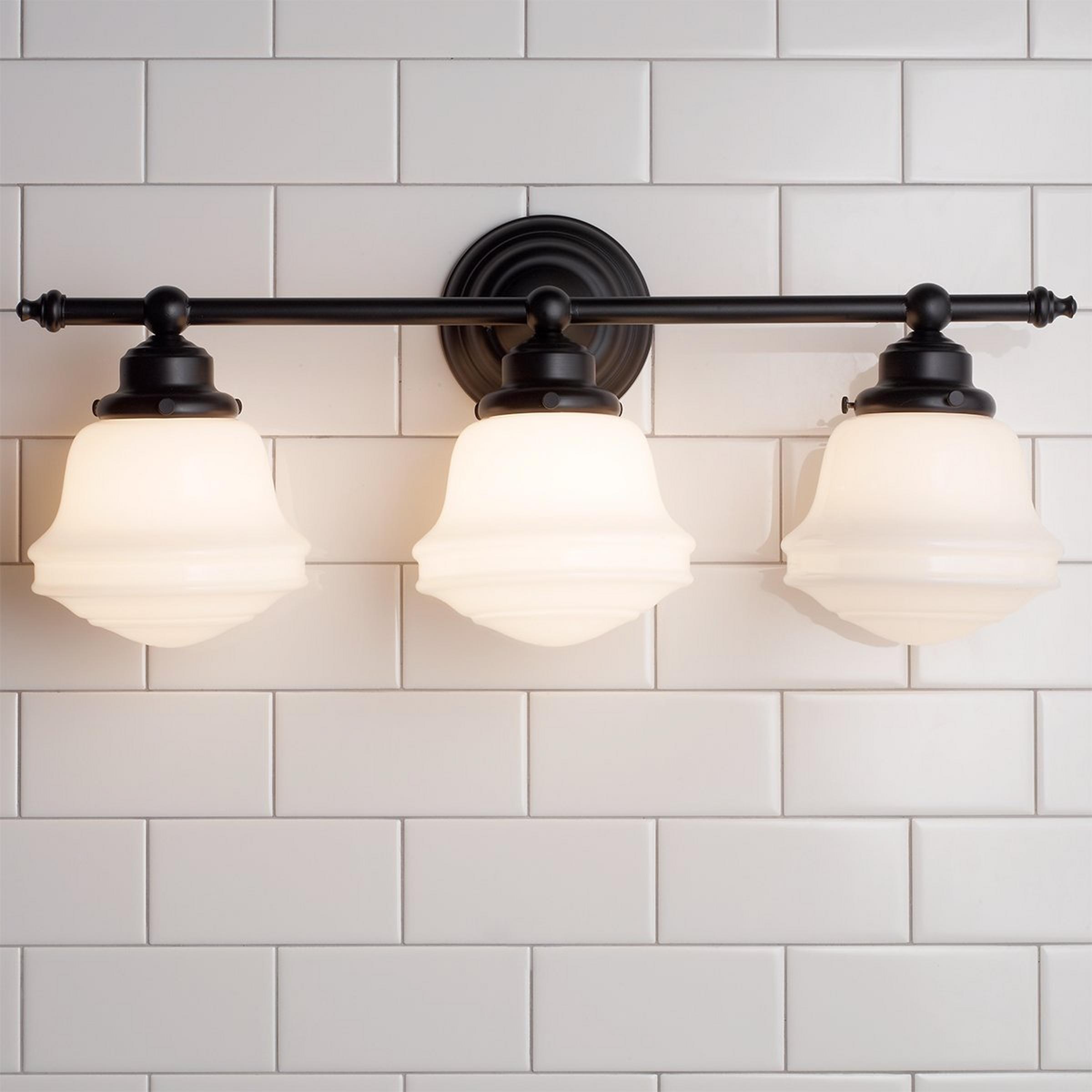 This three-light bathroom fixture features a milk glass look that would look great above any bathroom vanity.