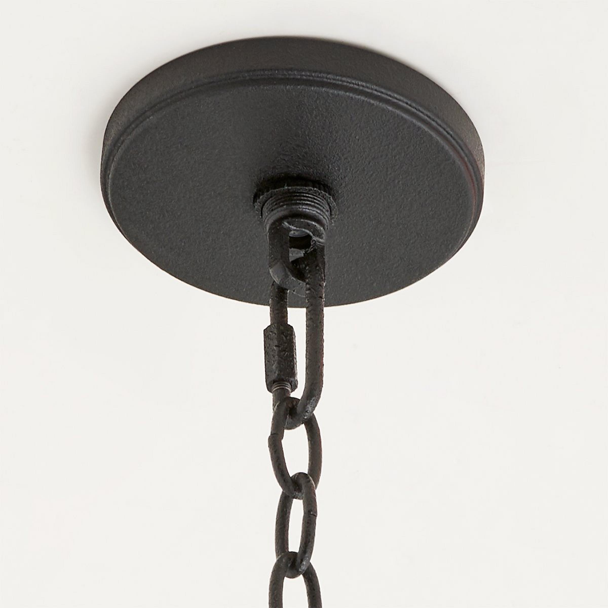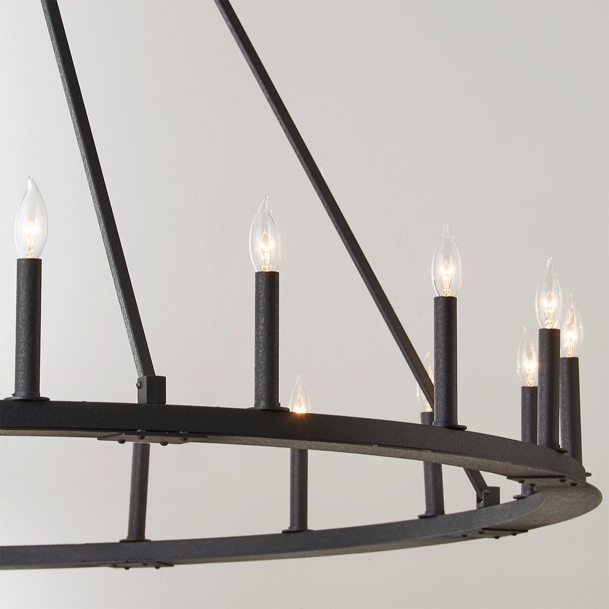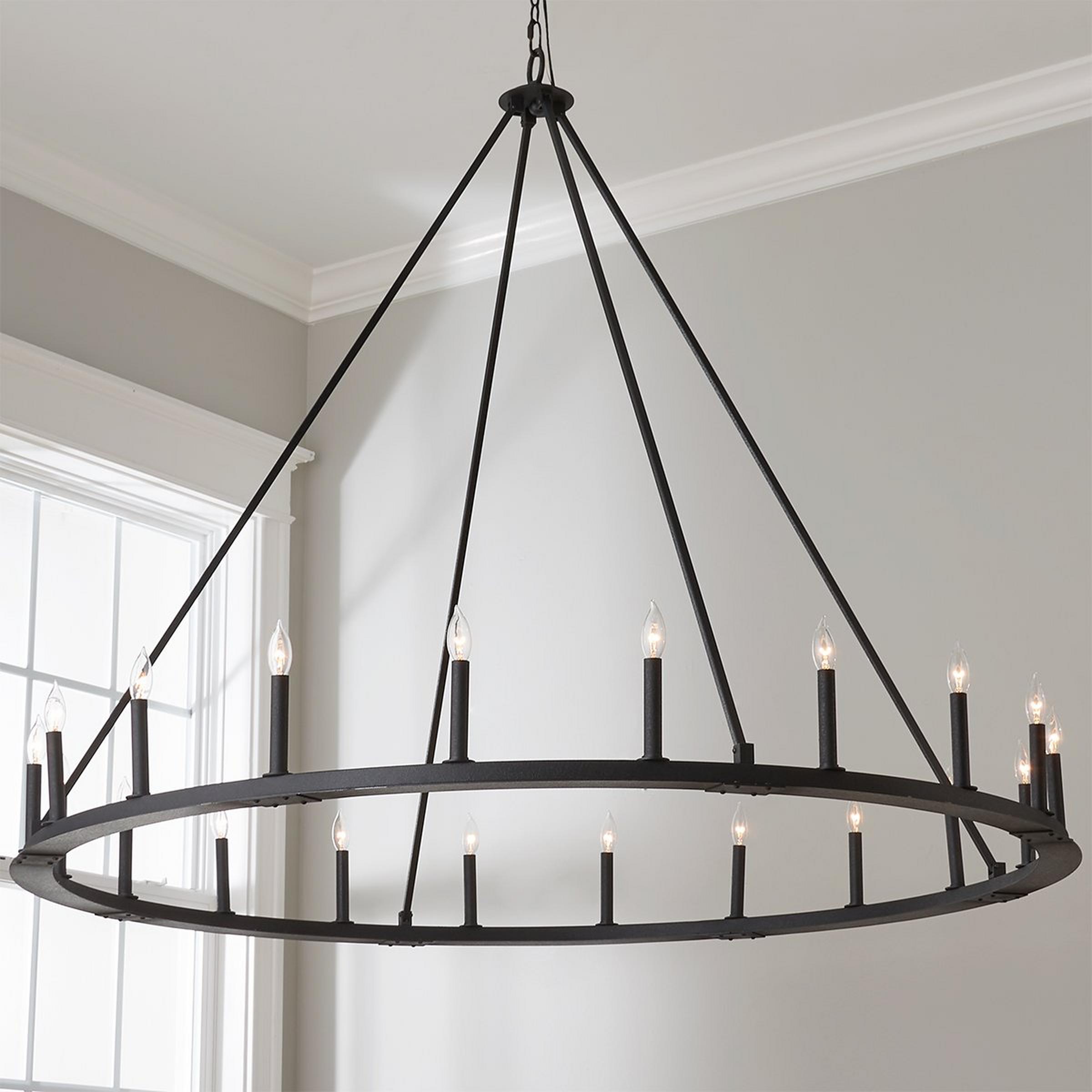 This substantial chandelier offers an unadorned minimalist silhouette consisting of a large ring with four rods extending upward in a pyramidal shape. Style abounds in the simple and elegant design for a dramatic yet accessible lighting choice that offers a more updated take on industrial, farmhouse or rustic chic design. The stately presence of this minimal design makes it a unique dining room, foyer, or entryway chandelier option.