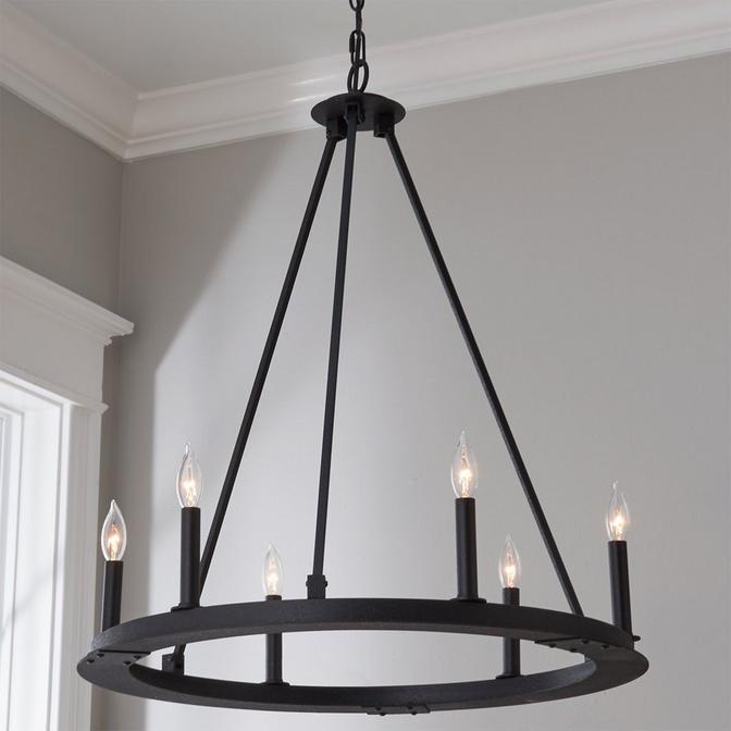 This substantial chandelier offers an unadorned minimalist silhouette consisting of a large ring with rods extending upward in a pyramidal shape. Style abounds in the simple and elegant design for a dramatic yet accessible lighting choice that offers a more updated take on industrial, farmhouse, or rustic chic design. The stately presence of this minimal design makes it a unique dining room, foyer, or entryway chandelier option.