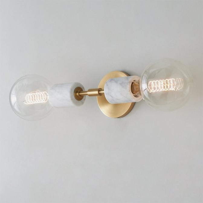 An incredibly simple design gets a sophisticated upgrade in this refined sconce. A minimalist backplate and body in Aged Brass or Polished Nickel is accented by the addition of White marble sockets, giving this modern fixture a timeless elegance.