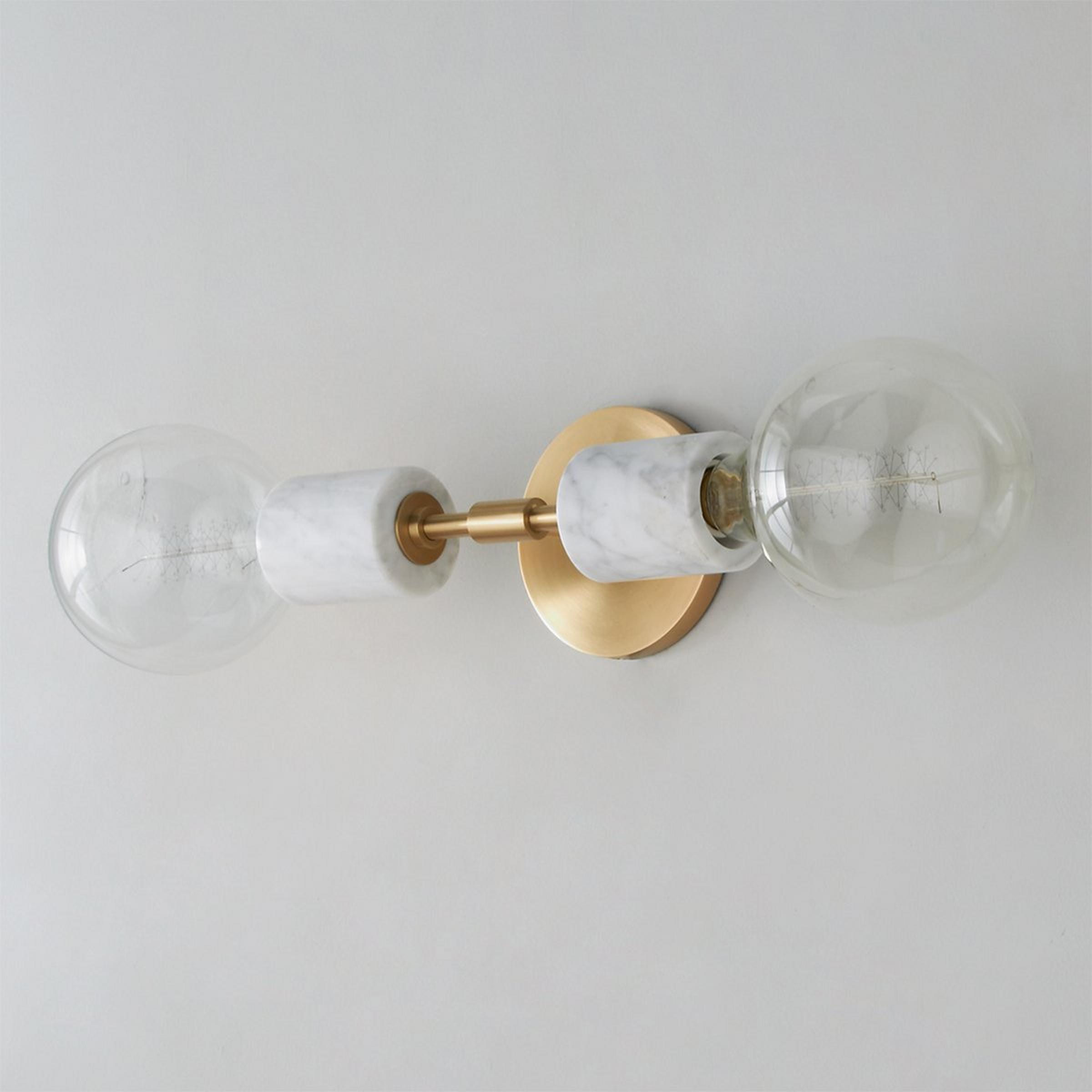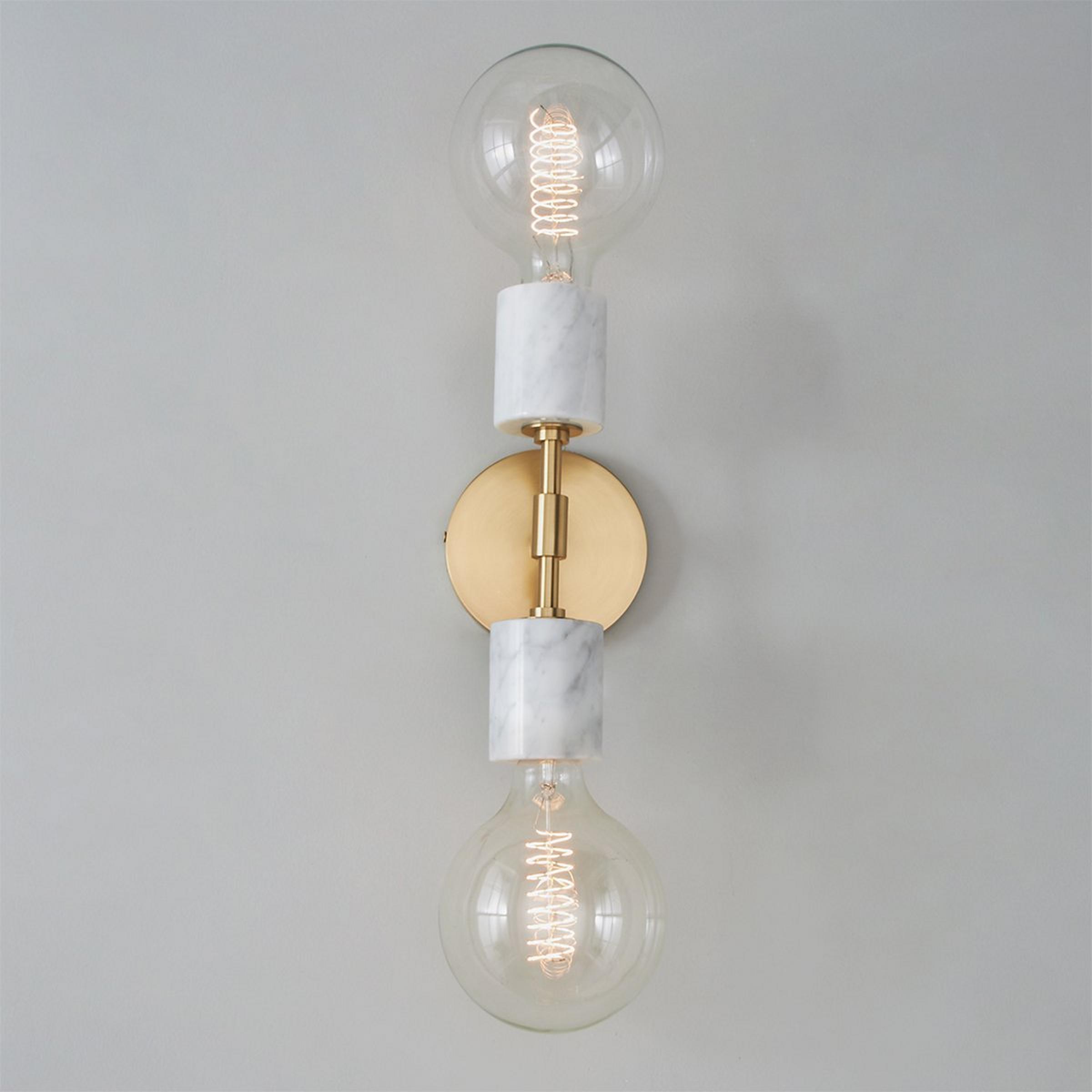 An incredibly simple design gets a sophisticated upgrade in this refined sconce. A minimalist backplate and body in Aged Brass or Polished Nickel is accented by the addition of White marble sockets, giving this modern fixture a timeless elegance.