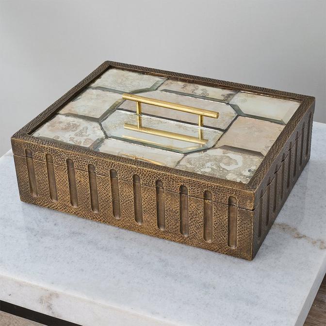 Beveled antique mirror pieces fit together with a craftsman's precision on the top of this lush gold box. Perfect as a glamourous accent to liven up any space and add a little sparkle without being too overstated.