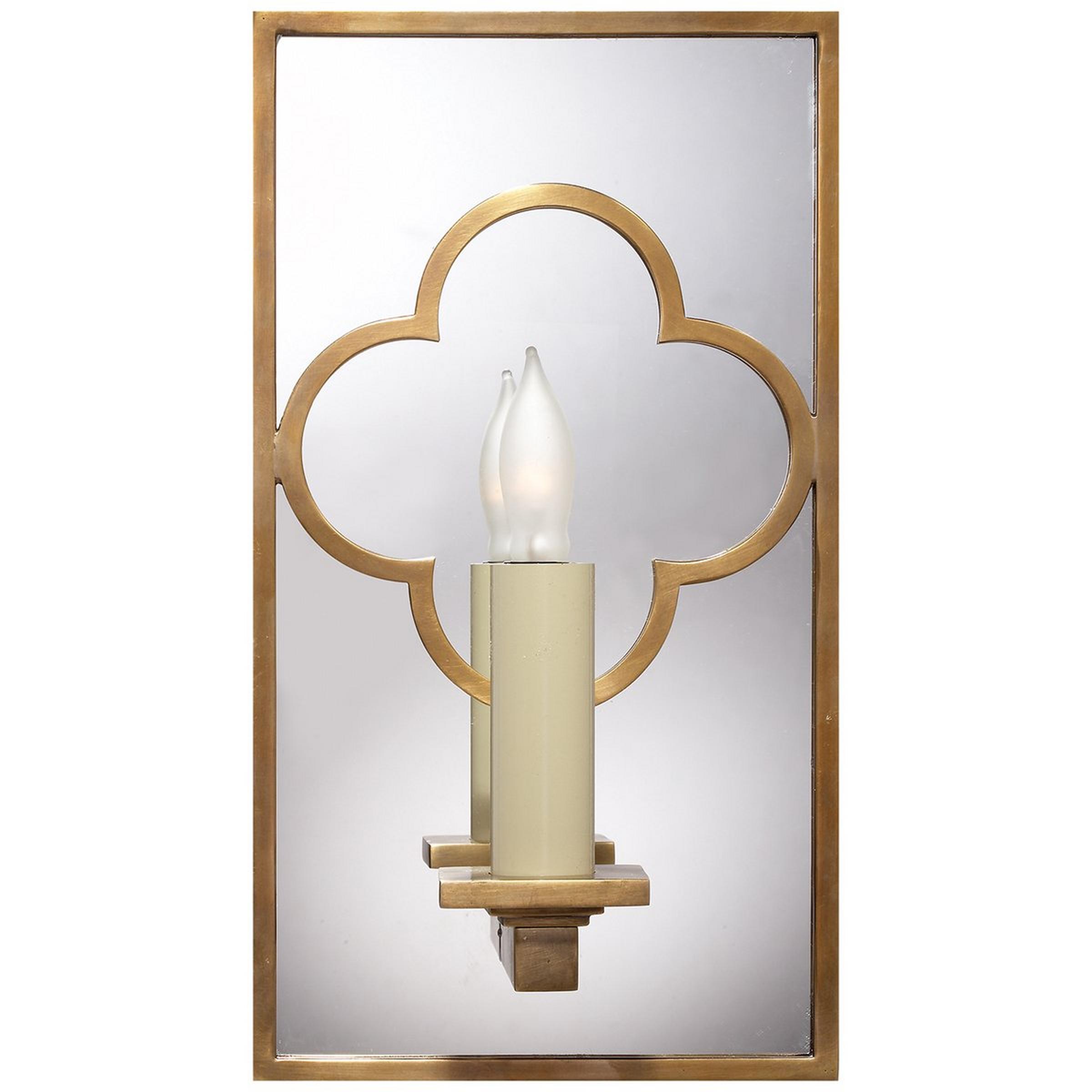 This fashion-forward modern sconce features a rectangular mirrored backplate with quatrefoil detailing framing the candelabra bulb for a simple, trendy fixture perfect for adding sleek flair to any space. Available in Polished Nickel, Antique Nickel, Antique Brass, and Bronze finishes. 1x60 watt max candle base sockets. (11"Hx6"Wx4.5"E). Backplate (11"Hx6"W).