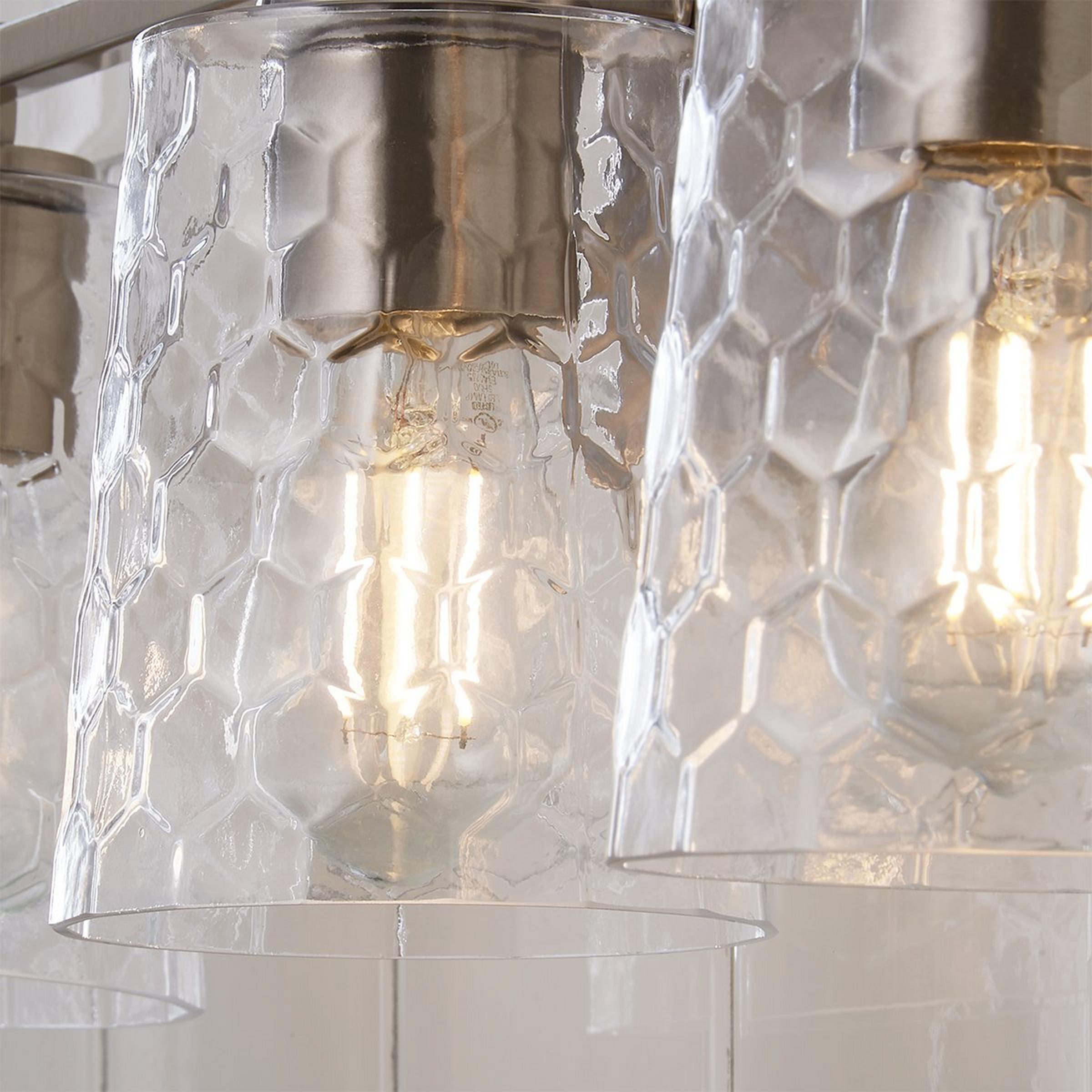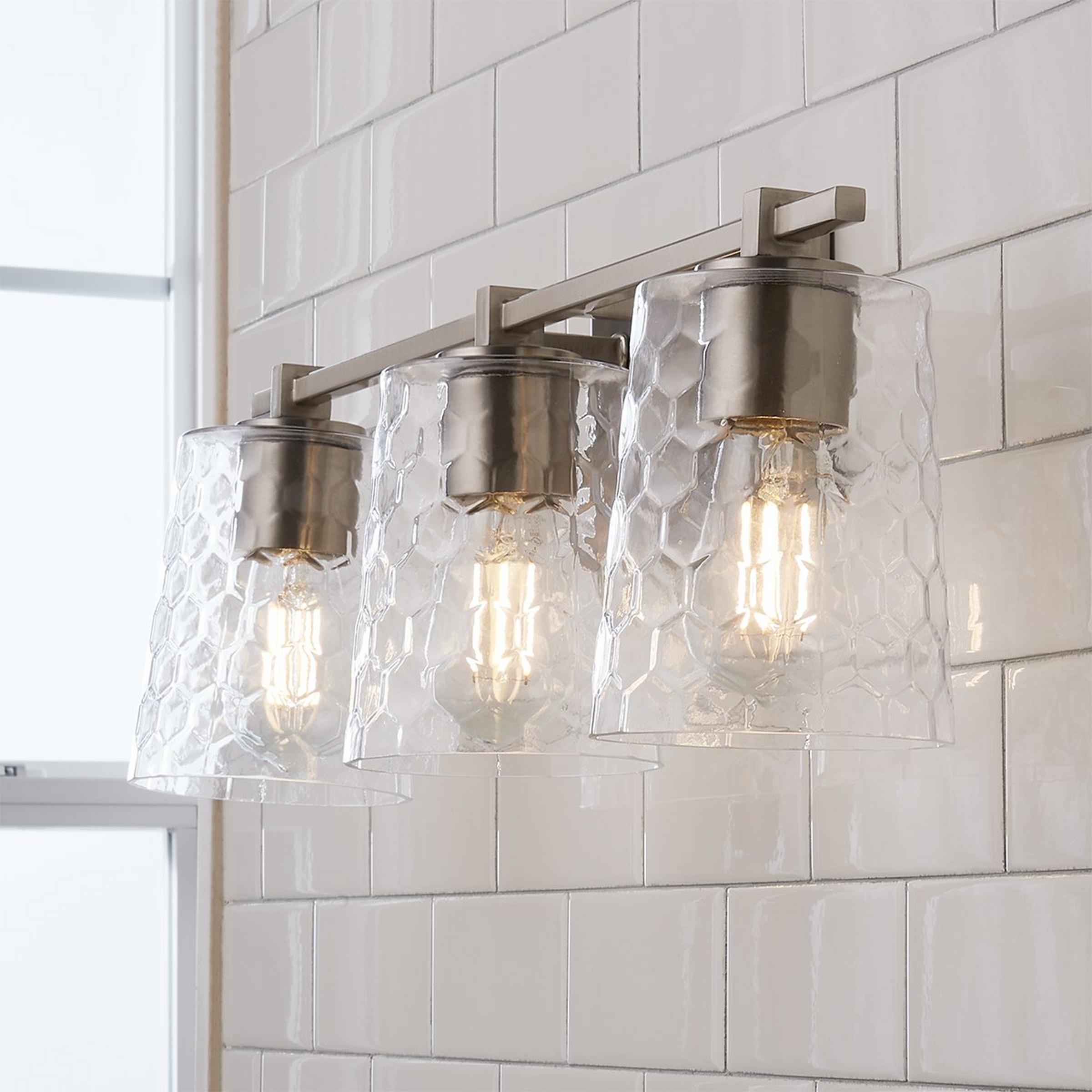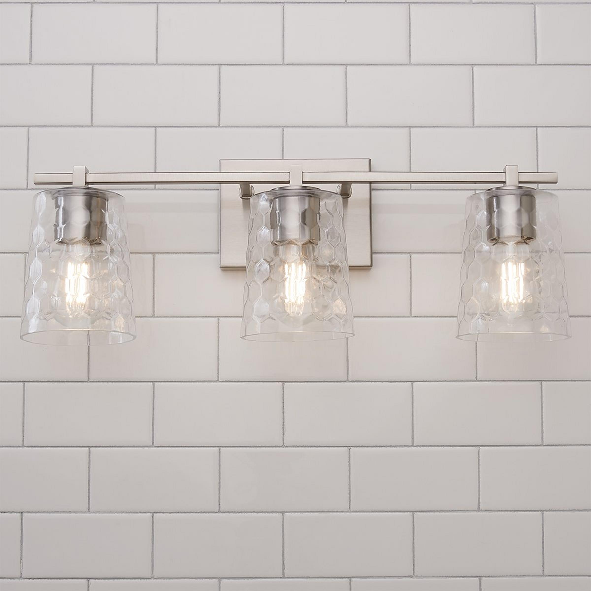 Our Mod Comb Vanity Collection will have your master bath singing with style. The modern hardware has a linear structure adorning the honeycomb tapered clear shades. Available in a variety of shapes and finishes, finding one to match your space will be as sweet as honey.