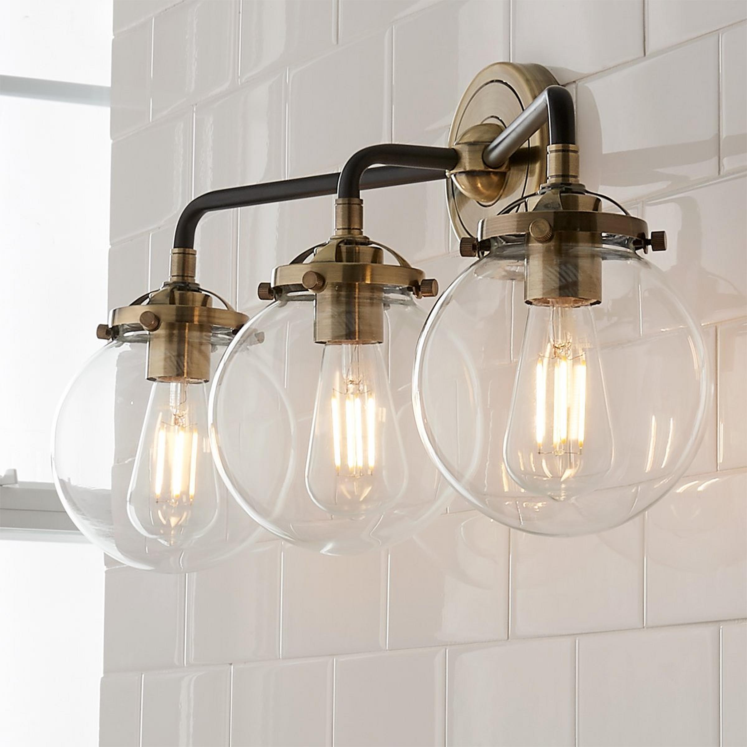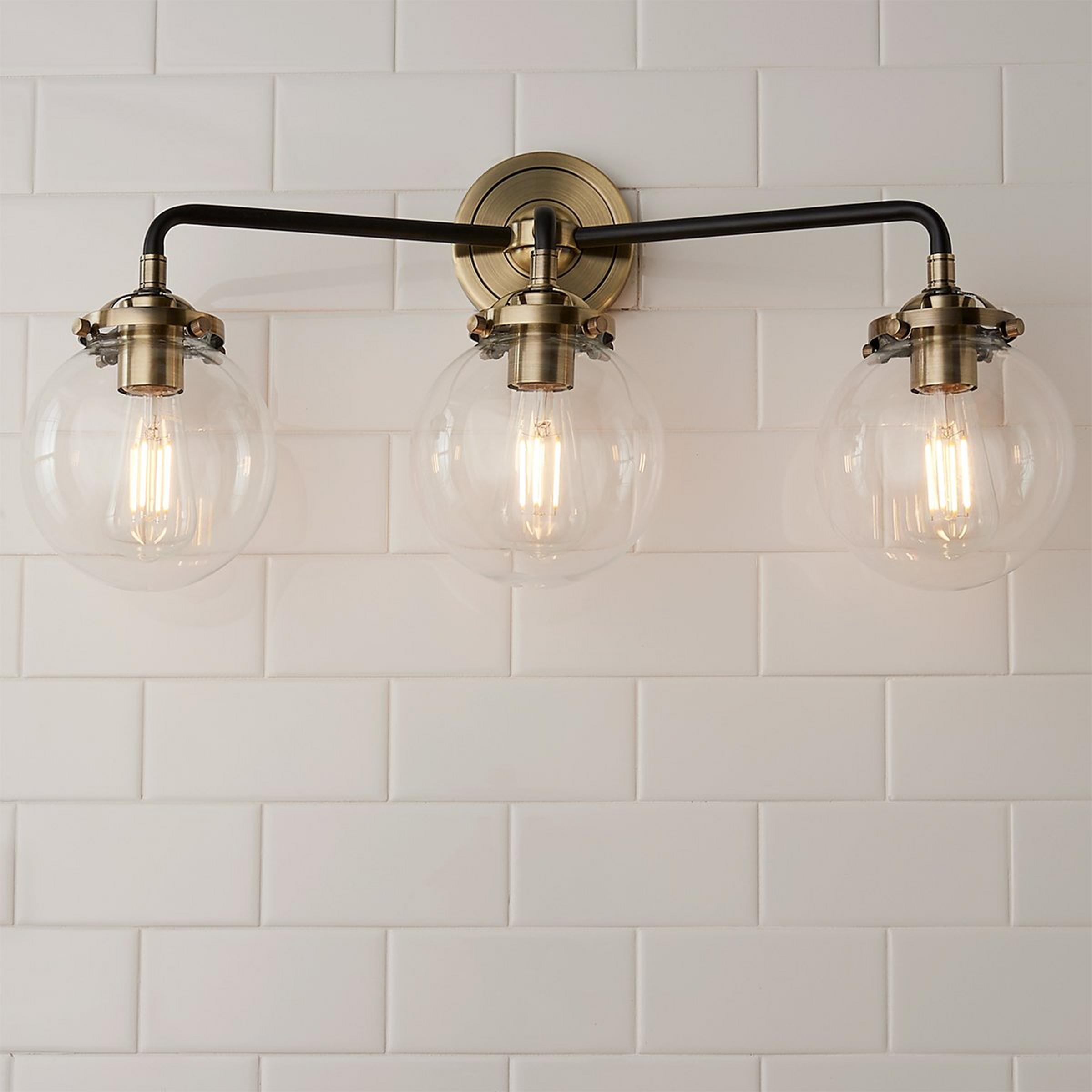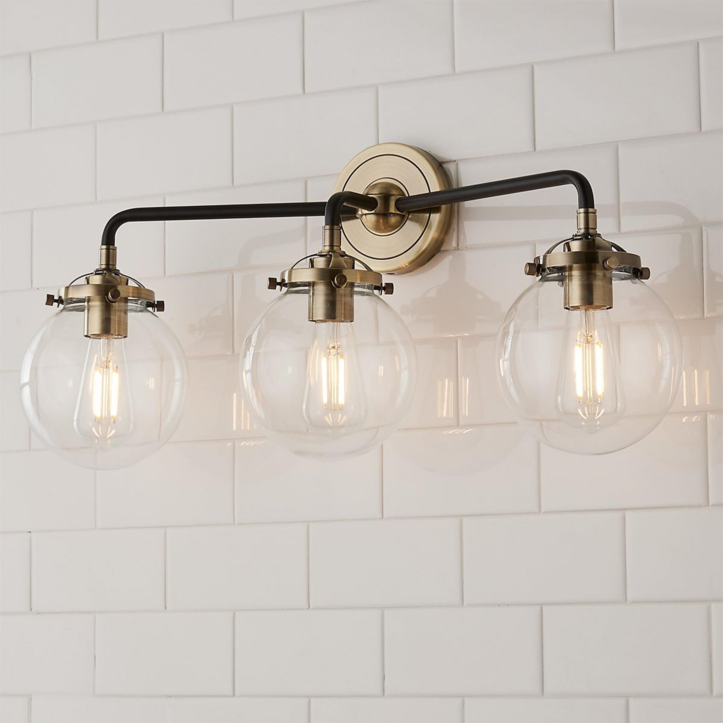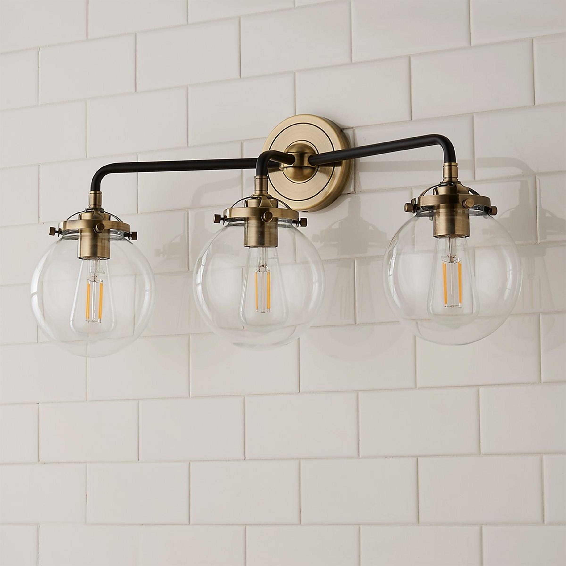 This beautiful mid-century modern vanity light features clear glass globe shades and a metal frame in several stylish finishes.