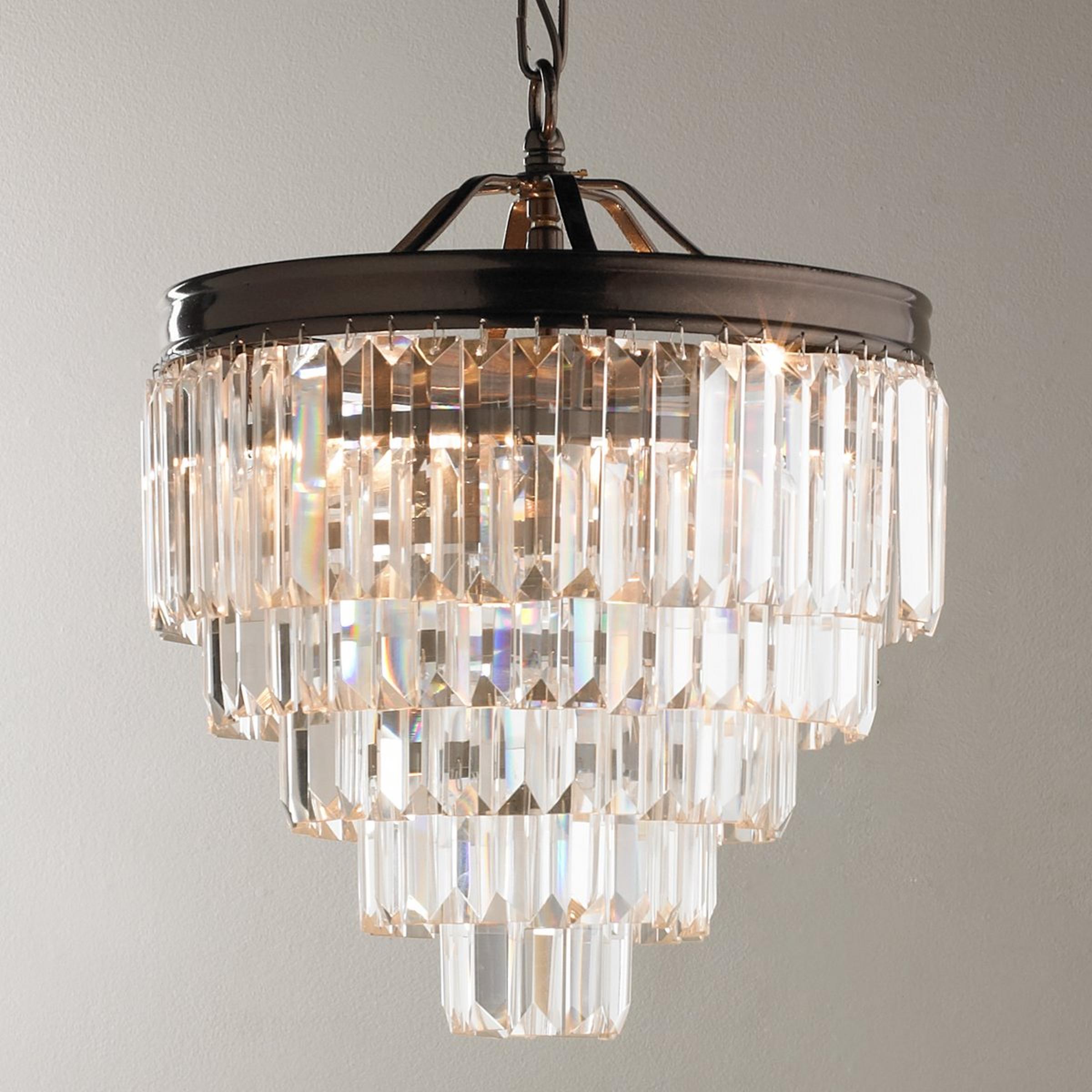 Sleek angled glass prisms dangle from a metal frame in five tiers for layers of sparkling style. Convertible from hanging chandelier to semi-flush mount ceiling light, this modern take on the classic empire style crystal chandelier is a blend of sleek banding adorned with five-sided clear glass crystals. The look has the allure of restoration era luxury for interiors ranging from industrial to glamorous.
