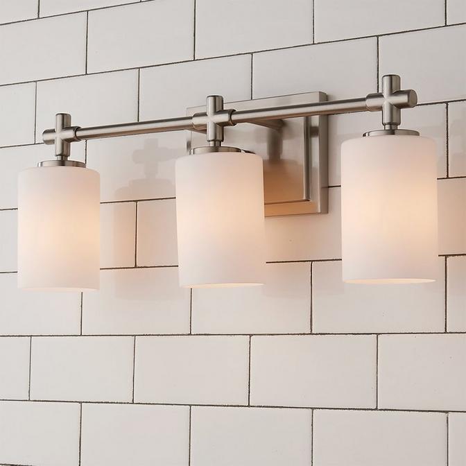 This sleekly modern vanity light features Etched Opal diffusers and attractive cross detailing at each light source.