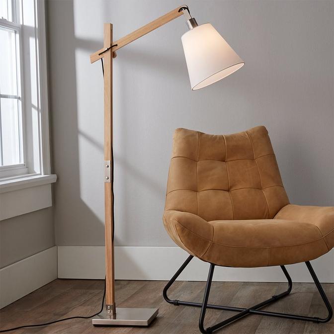 Natural wood posts and satin steel accents construct this modern rustic adjustable arm floor lamp. Wood pegs adjust the height and angle of the off white cotton shade for directing light. The black fabric cord is tucked in an open channel on the square post and hangs from the back of the lamp. This floor lamp is a must have from rustic lodge to urban modern style.