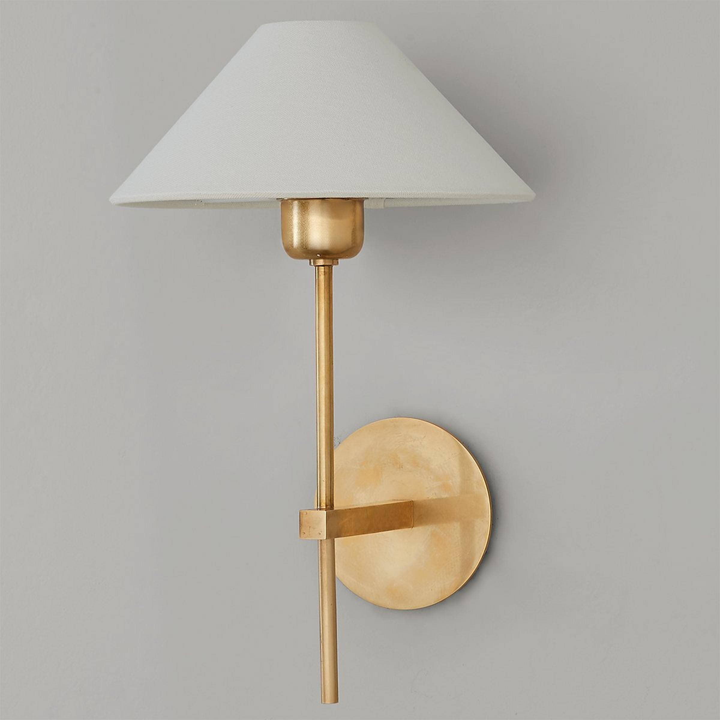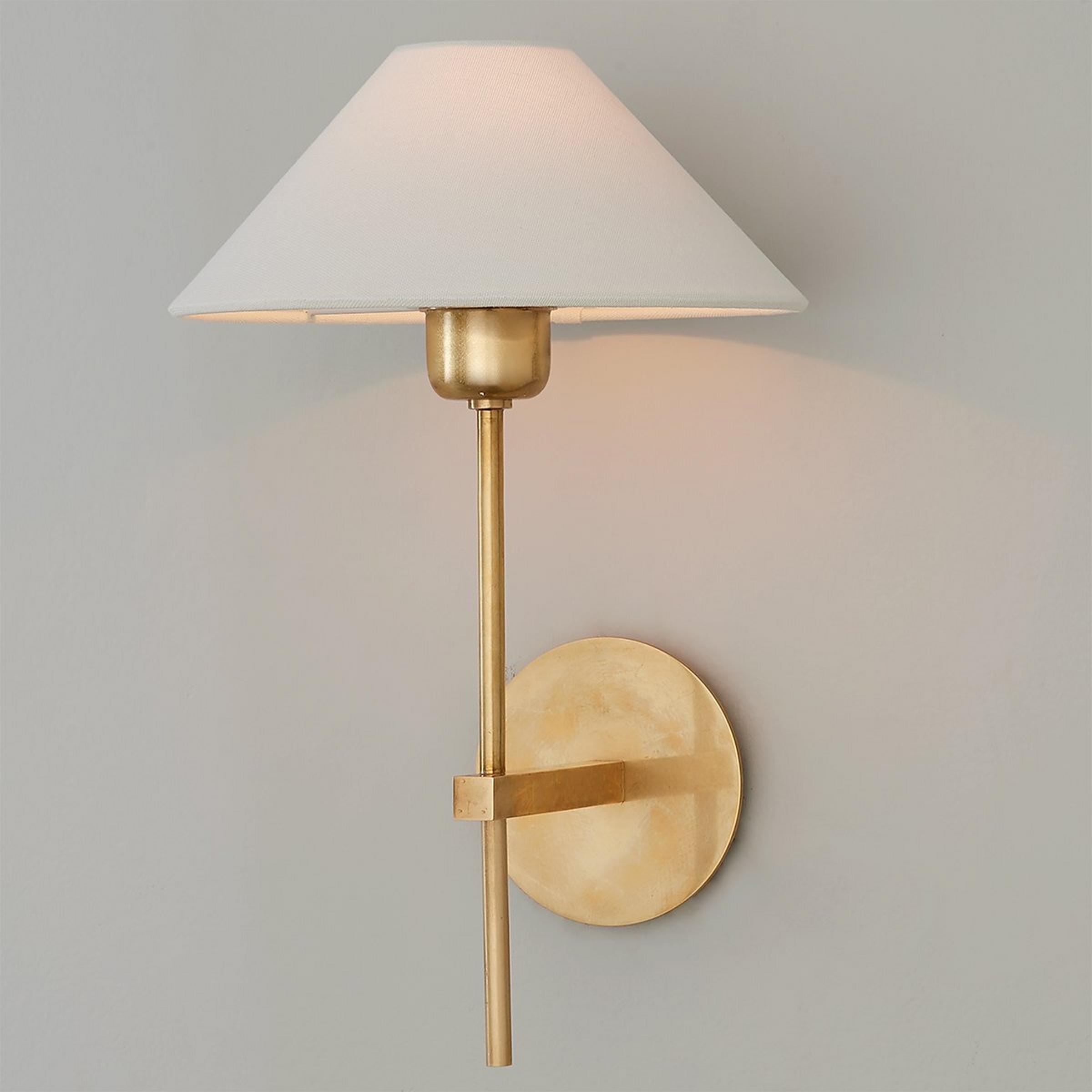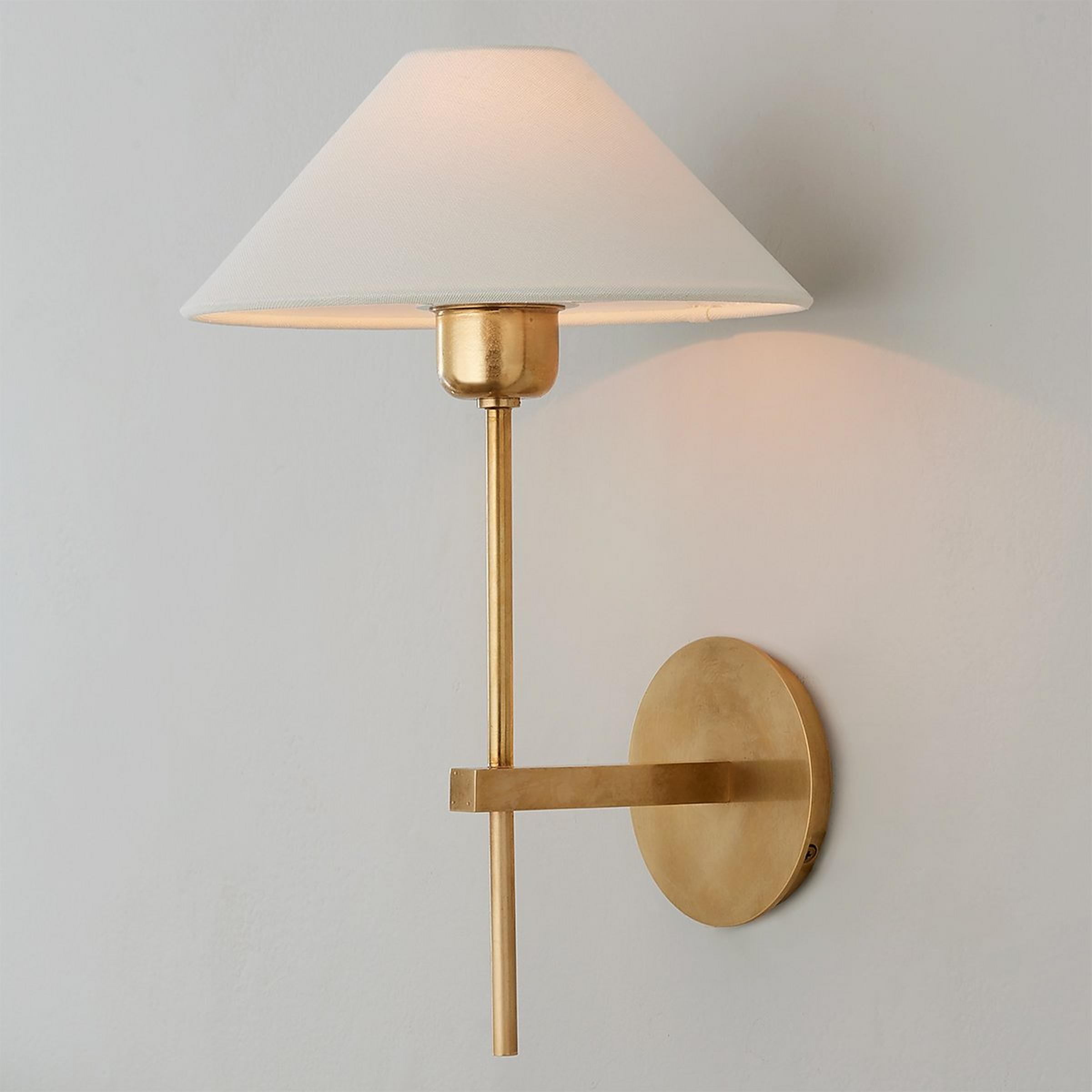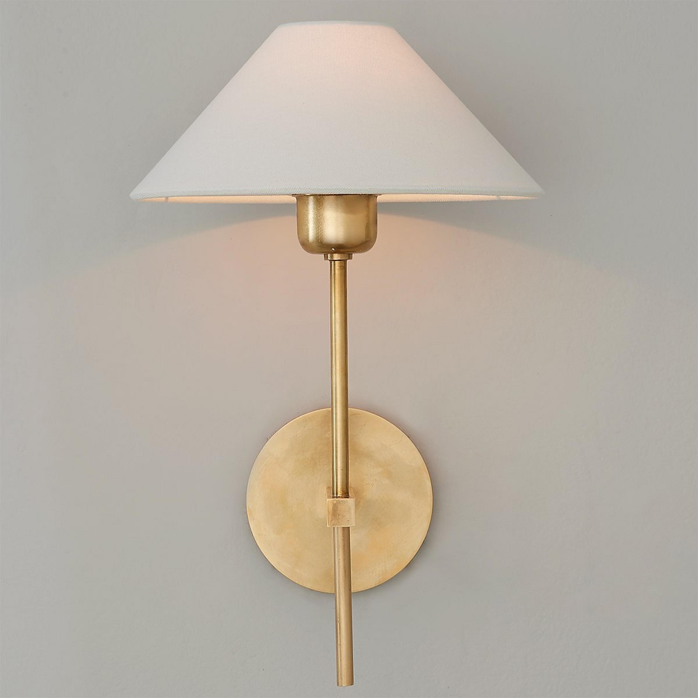 A simple rod mounted on a round backplate and capped with a quirky flared linen shade makes up this trendy modern sconce perfect for adding subtle style to any space.