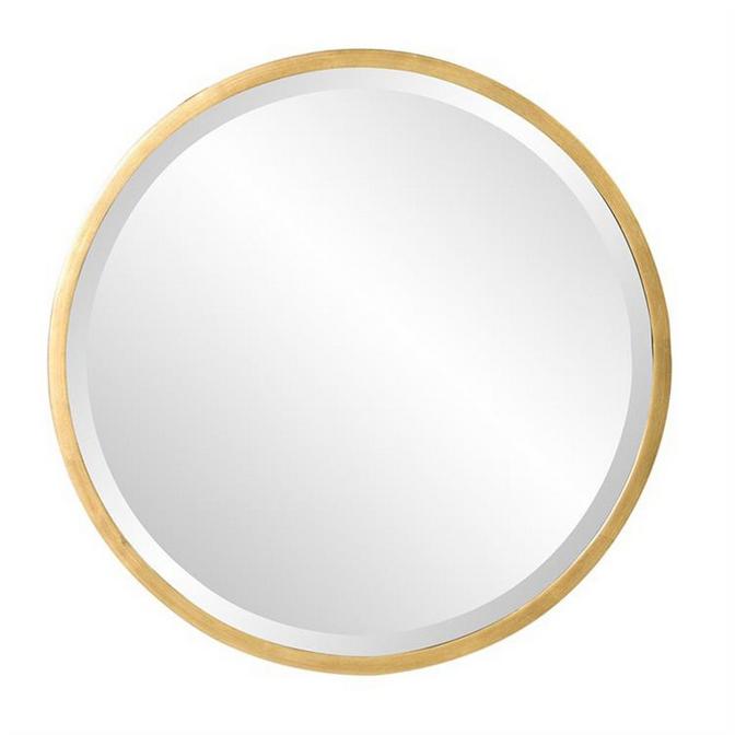 The Modern Shadowbox Mirror features a simple round frame that is deep like a shadowbox and finished in a glossy black. The front edge of the frame is finished in a gold leaf creating an interesting effect. When you look at the mirror from the front, it looks gold, but when you look at it from the side, you see its glossy black finish. This perfectly sized mirror makes an ideal focal point for an entryway, bathroom, bedroom or any room in your home. D-rings are attached to the back of the mirror for a simple installation. The mirrored glass on this piece is not beveled. Wood and mirrored glass. Dimensions: 24" Diameter x 2.5"D; Inner Dimensions: 20" Diameter