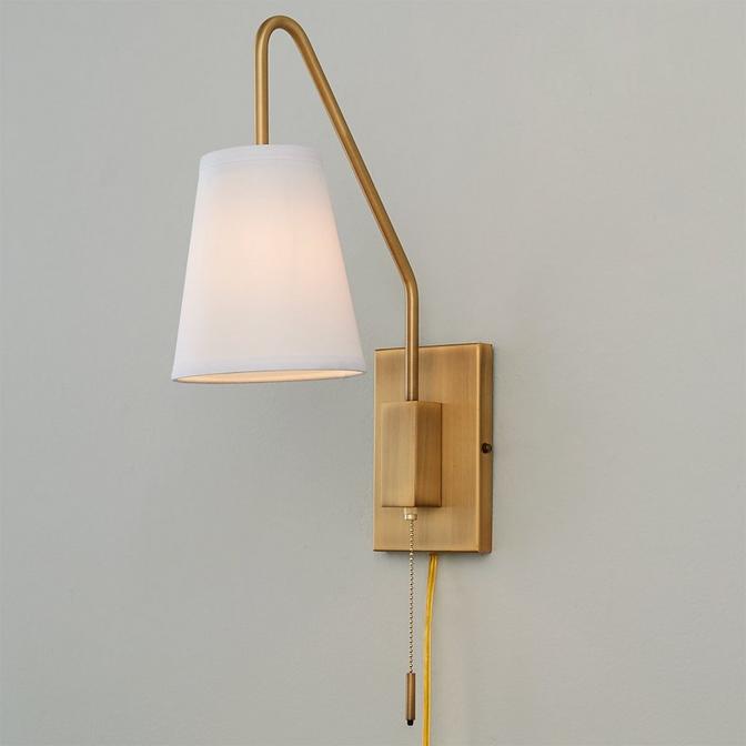 An angular arm with soft curves updates this classic swing arm design with a heavy modern flair. The simple tapered shade grounds the look and directs the light in style.