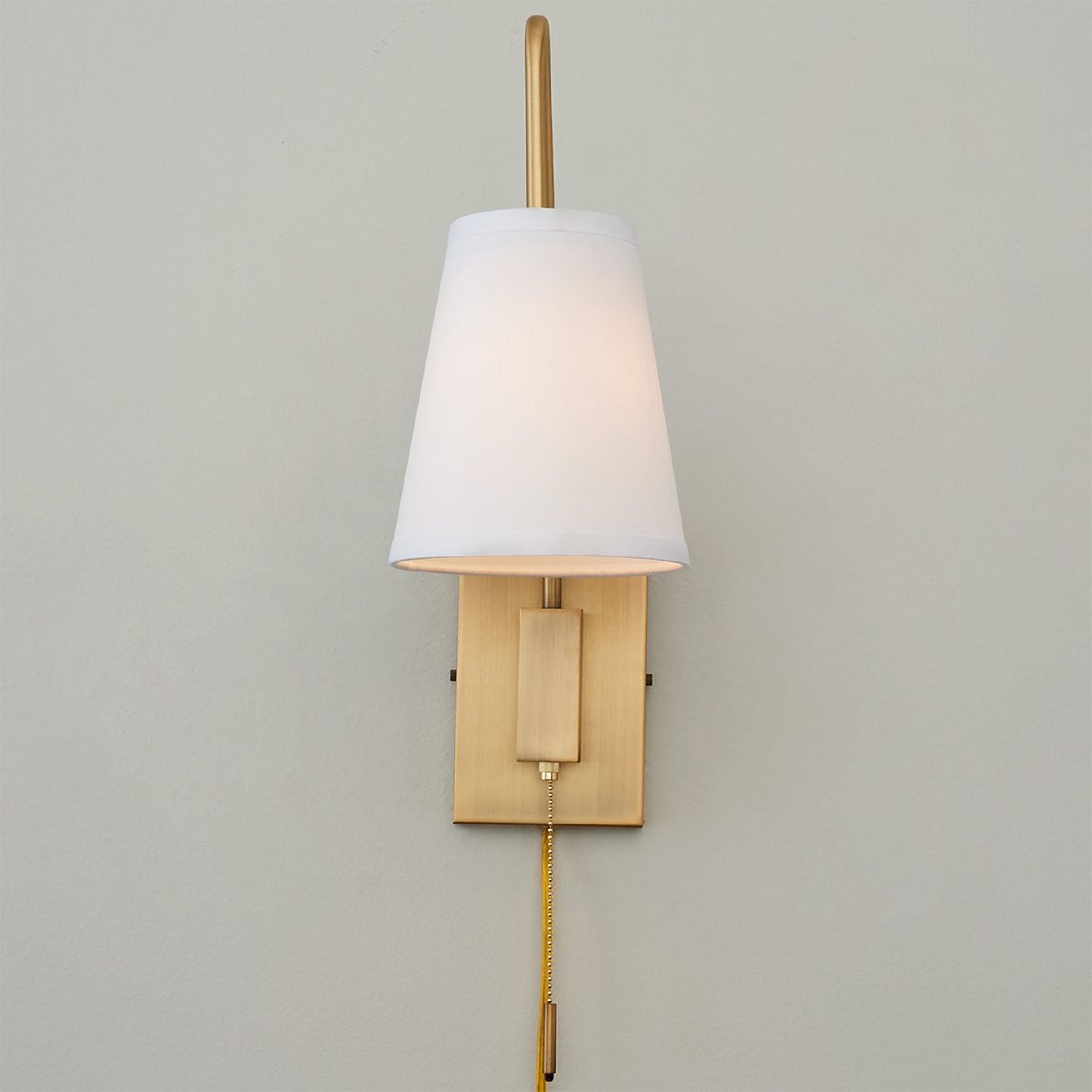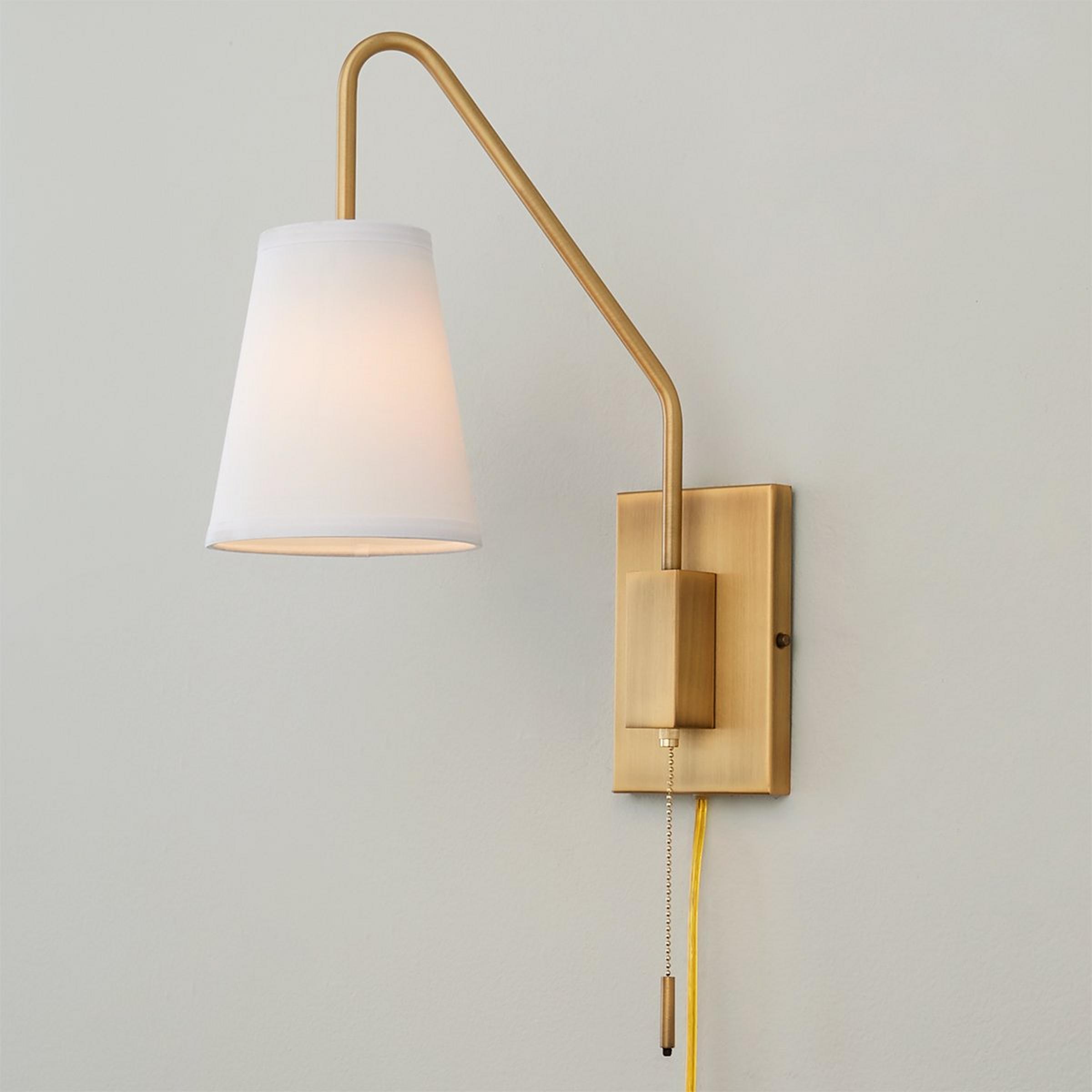 An angular arm with soft curves updates this classic swing arm design with a heavy modern flair. The simple tapered shade grounds the look and directs the light in style.