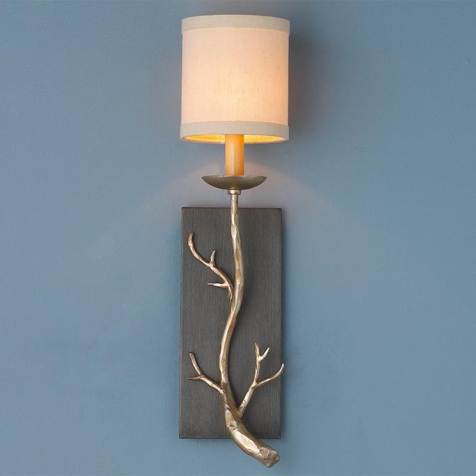 This modern twisted twig wall sconce will bring whimsical forest fantasy into your home. A branch of hand - forged iron in silver leaf finish contrasts the graphite bronze backplate. A cream linen hardback drum shade is included. 60 watts. (candle base socket) (21.25"Hx4.75"Wx5.75"D) Backplate: (11.5"Hx4.75"W)