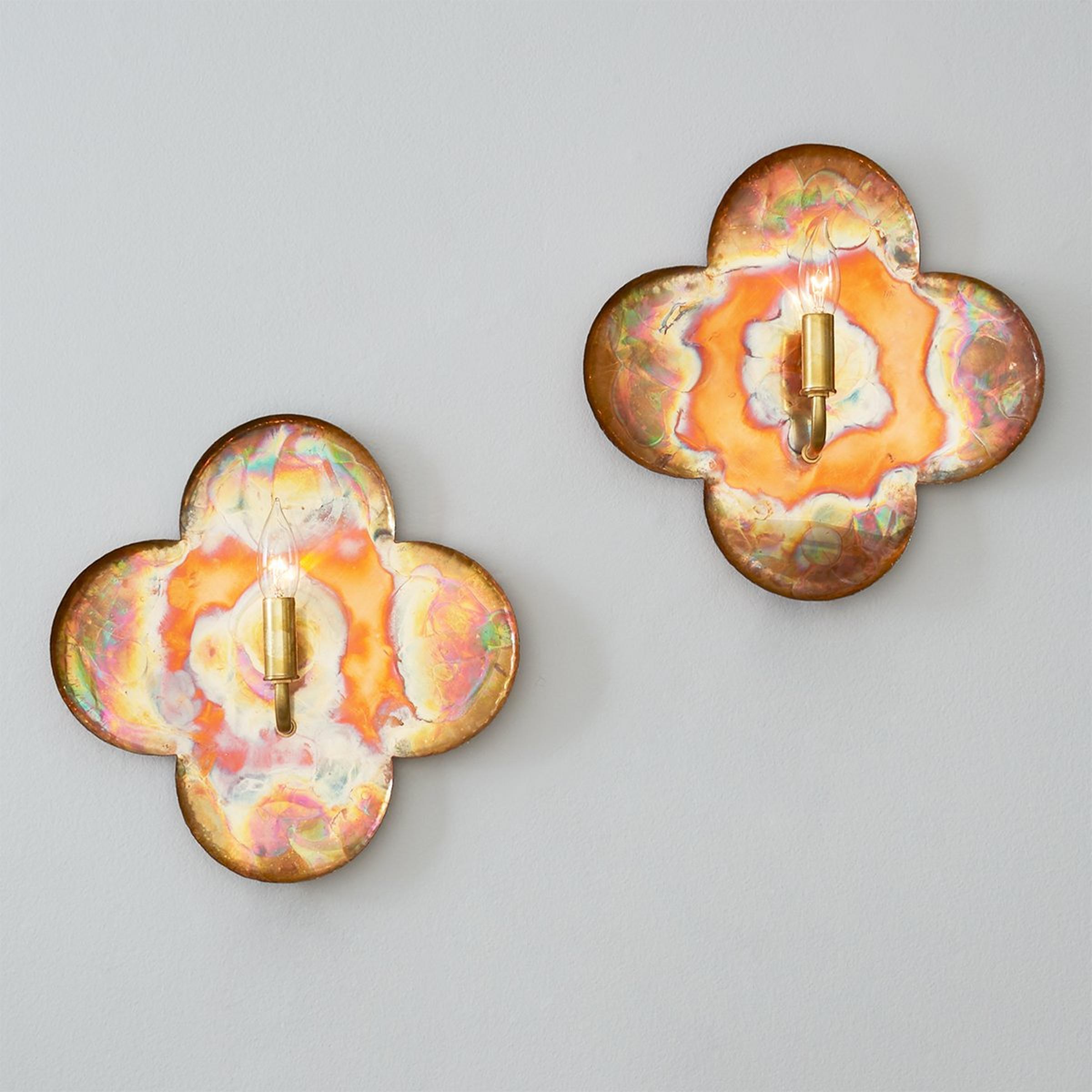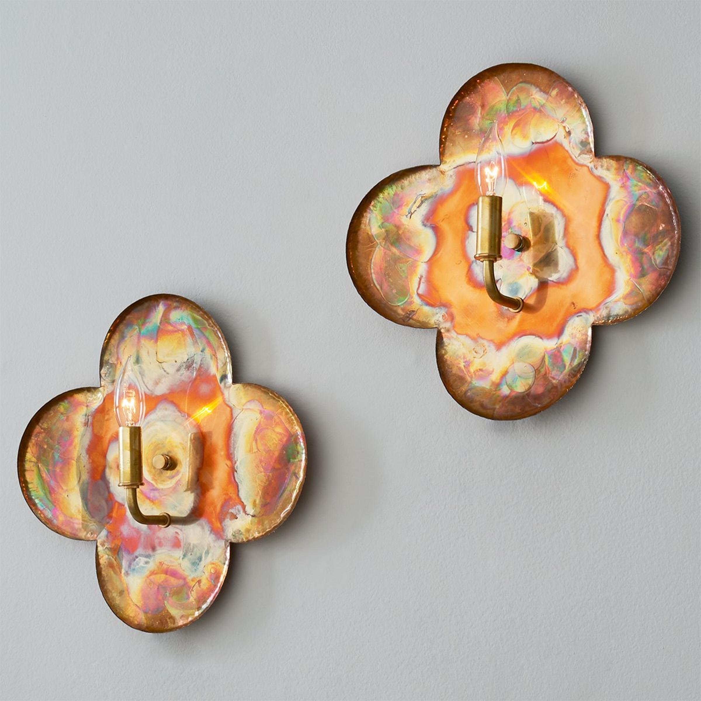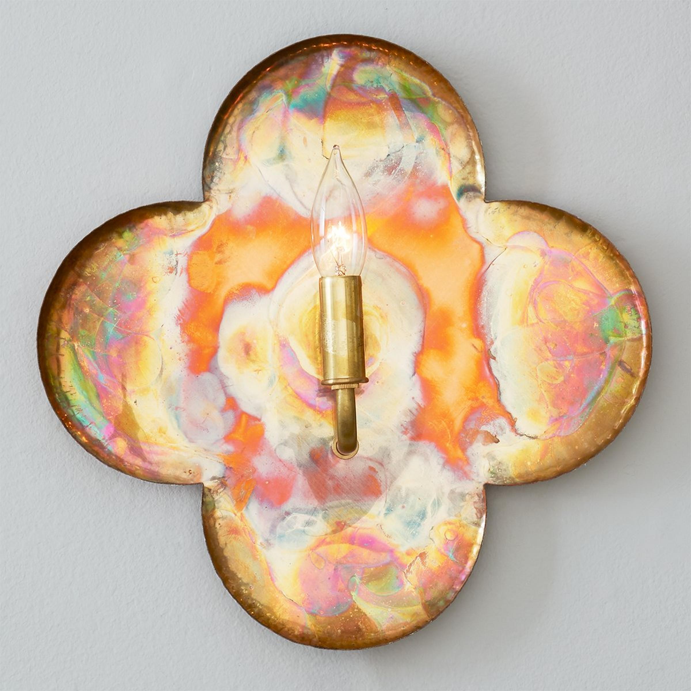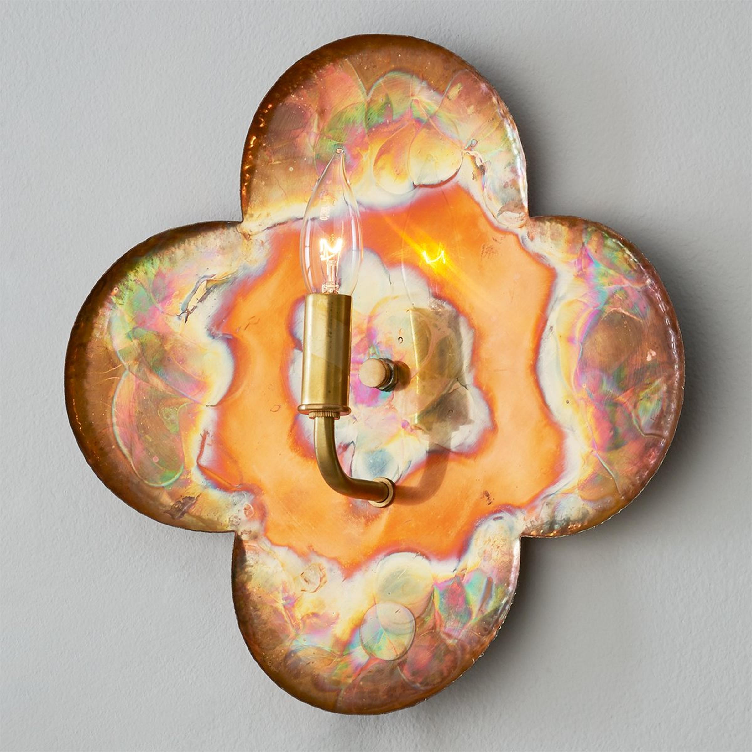 Southwestern style and high quality craftsmanship are the defining qualities of the Morelos Sconce. Fabricated and finished by hand in our Richmond, Virginia production facility by our skilled craftspeople, this sconce is annealed to create the rainbow effect on this sconce, which is most often seen in jewelry making. Because this is a natural reaction between the torch and the raw copper no two will ever be the same, making each of these a true work of art. This sconces are just at home in a craftsman bungalow as they are in a pueblo style home in the high desert and are sure to stand the test of time.