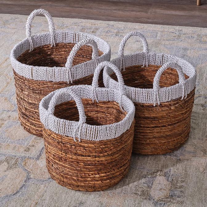 The Mount Pleasant Baskets, sold as a set of three, are woven from natural and sustainable materials with white trim, perfect for adding an organic touch to any space. Large (19Hx15Wx14D). Medium (17Hx14Wx13D). Small (16Hx12Wx12D).