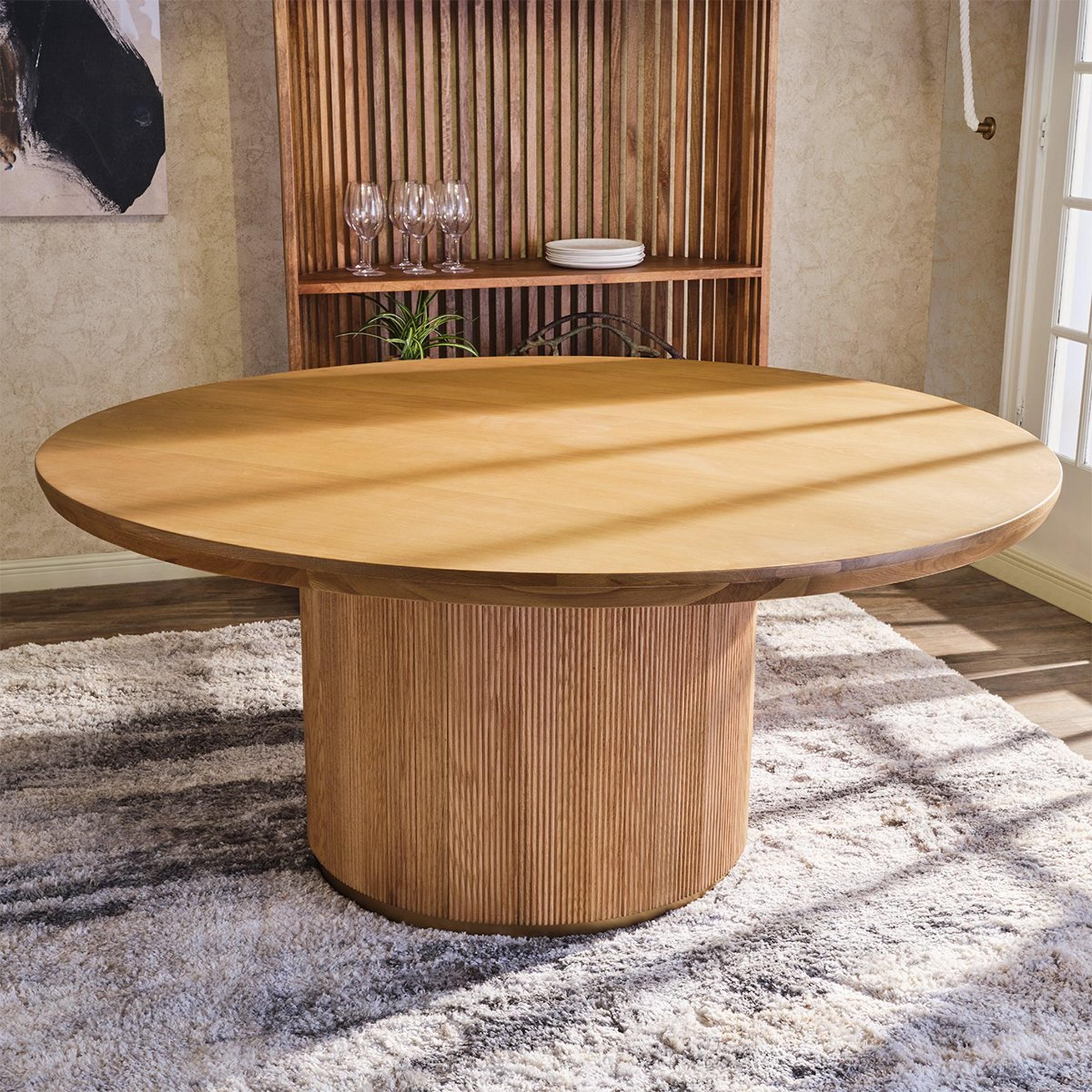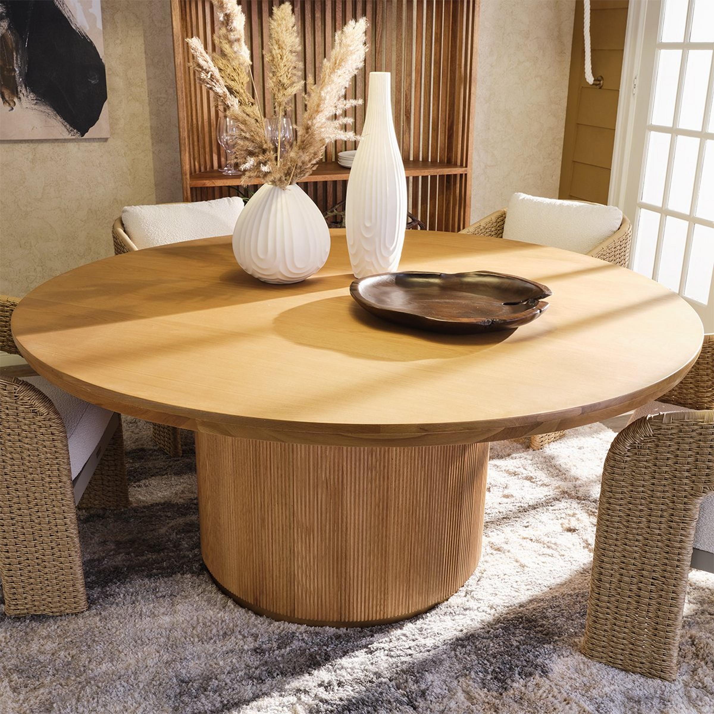 The Mykita Dining Table combines rustic wood with striking vertical reeding. Supported by a brushed gold steel base, it showcases unique natural variations such as indentations, cracks, and color disparities. Each table is one-of-a-kind, celebrating the beauty of organic materials and enhancing any dining space.